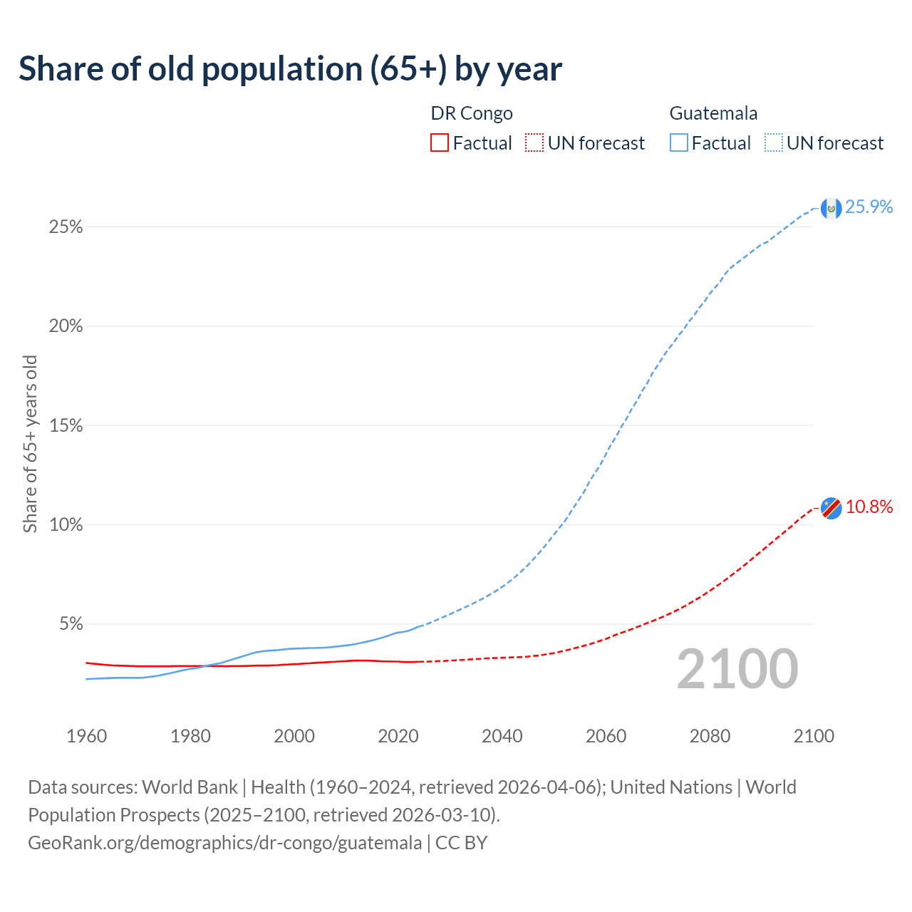 The share of older people aged 65 and over is 3.08% in the DR Congo and 4.85% in Guatemala. Life expectancy in the DR Congo compared to Guatemala .