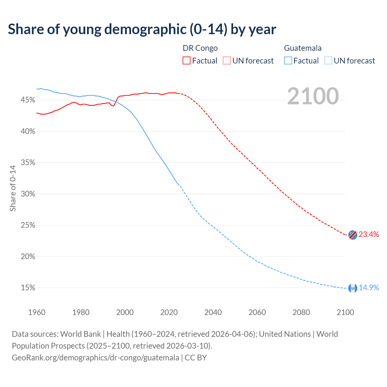 - The share of young demographic (0-15 years old) in the DR Congo is 46% vs 31.6% in Guatemala.