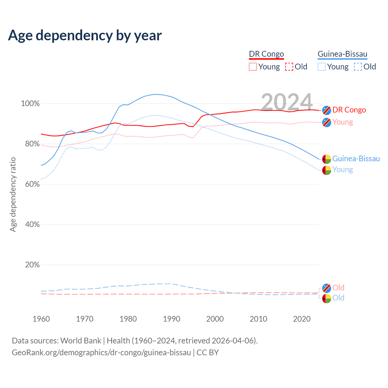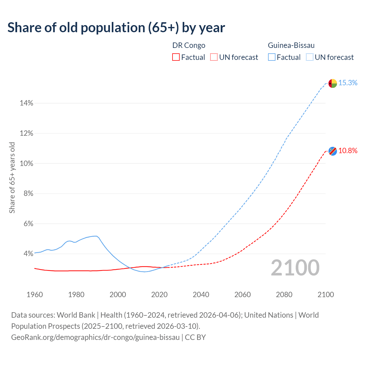 - The share of old-age demographic (65+) in the DR Congo is 3.08% vs 3.19% in Guinea-Bissau.