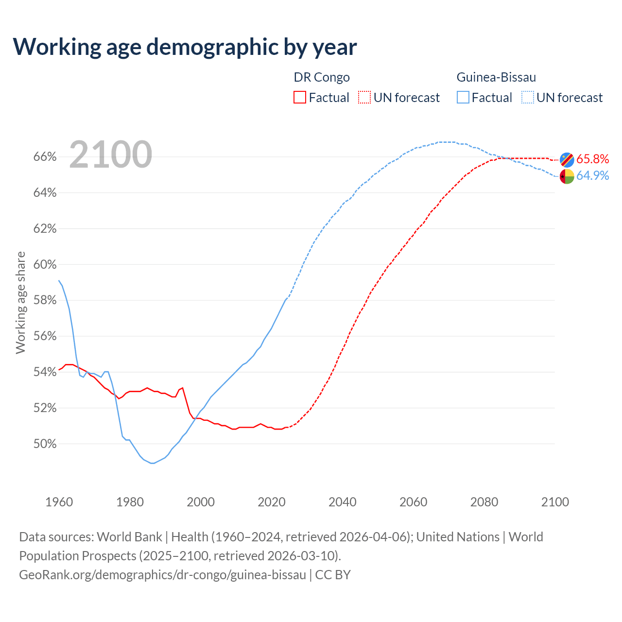 Median age DR Congo vs Guinea-Bissau, 1960-2100