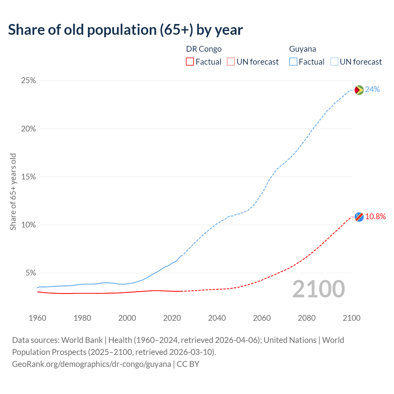- The share of old-age demographic (65+) in the DR Congo is 3.08% vs 6.73% in Guyana.