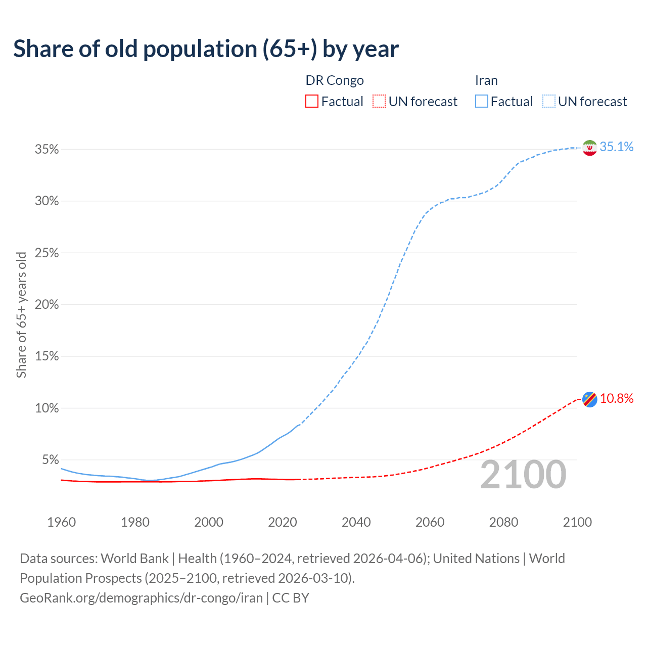 - The share of old-age demographic (65+) in the DR Congo is 3.08% vs 8.24% in Iran.