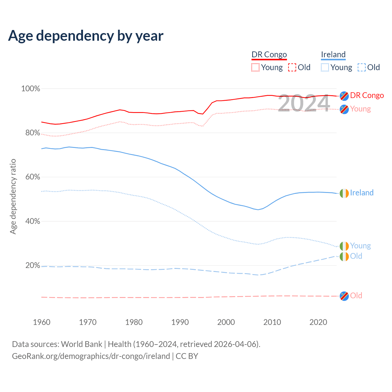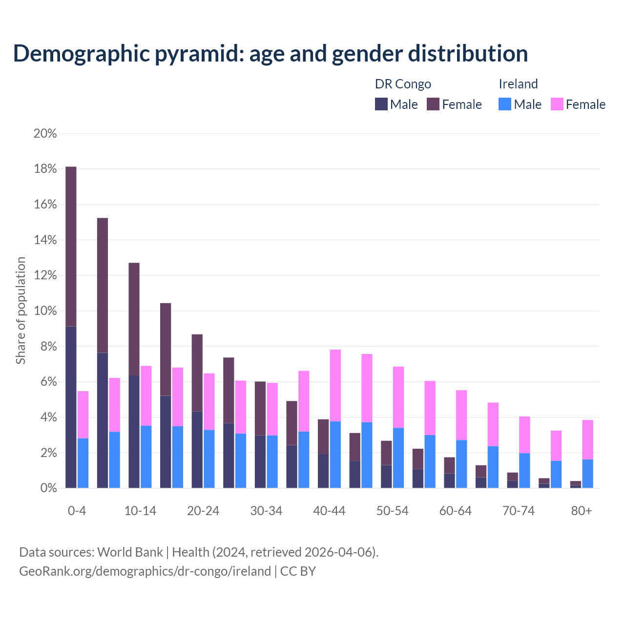 - The share of old-age demographic (65+) in the DR Congo is 3.08% vs 15.9% in Ireland.