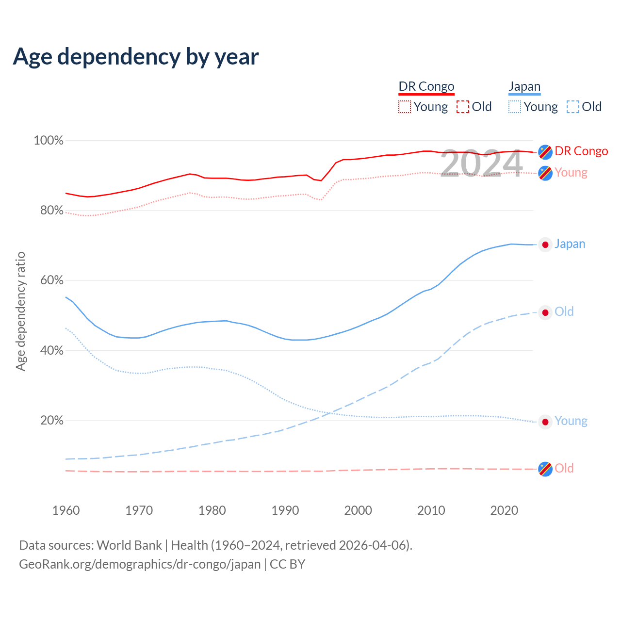 - The DR Congo is ranked 191/196 by median age (oldest to youngest) vs 2/196 for Japan.