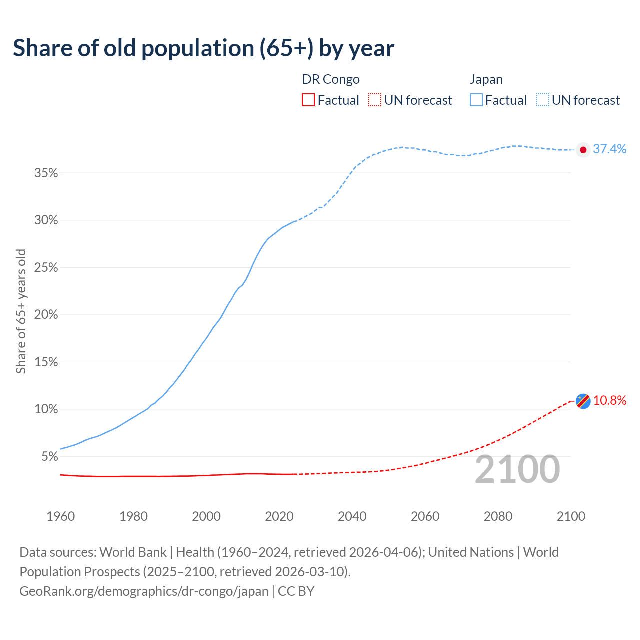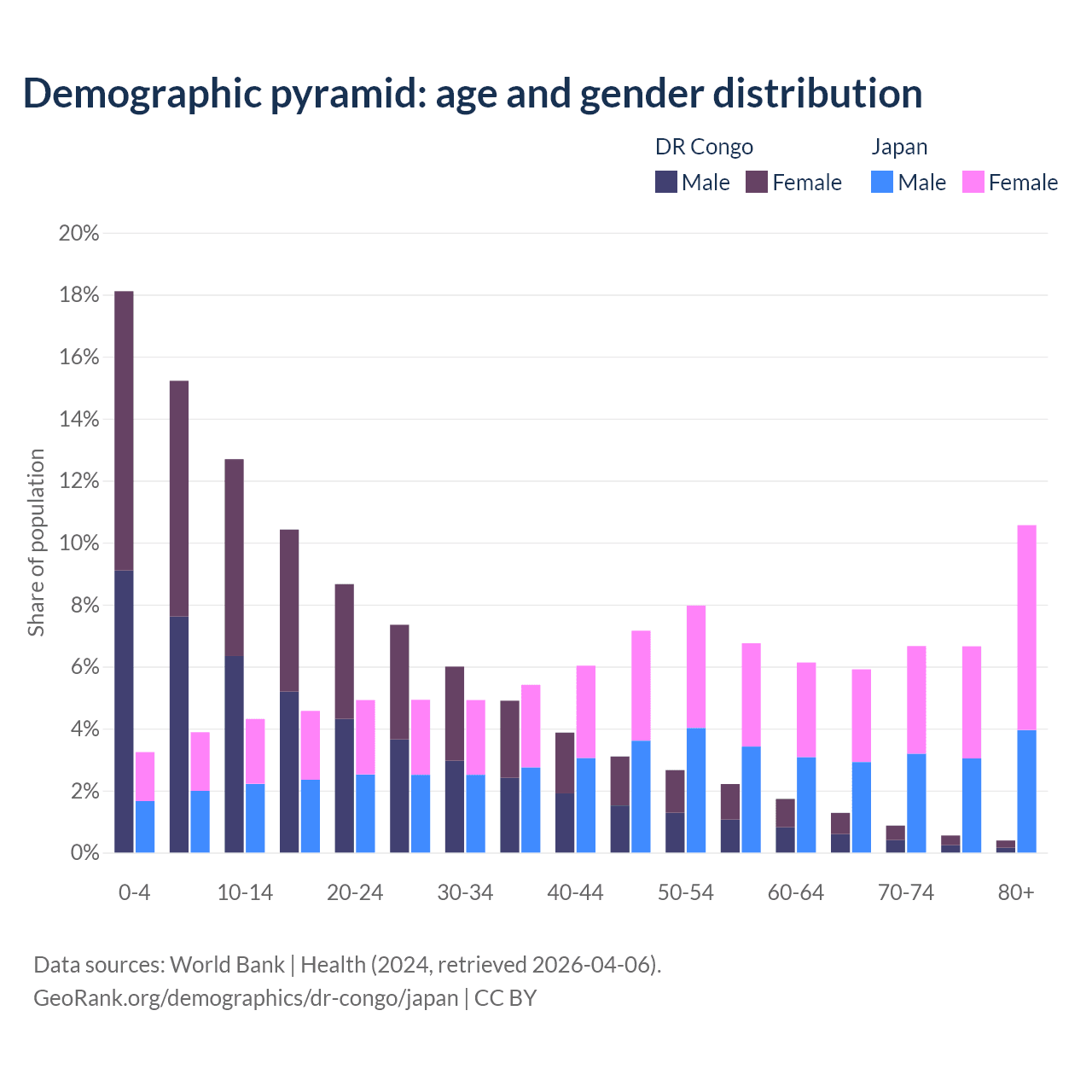 The share of older people aged 65 and over is 3.08% in the DR Congo and 29.8% in Japan. Life expectancy in the DR Congo compared to Japan .
