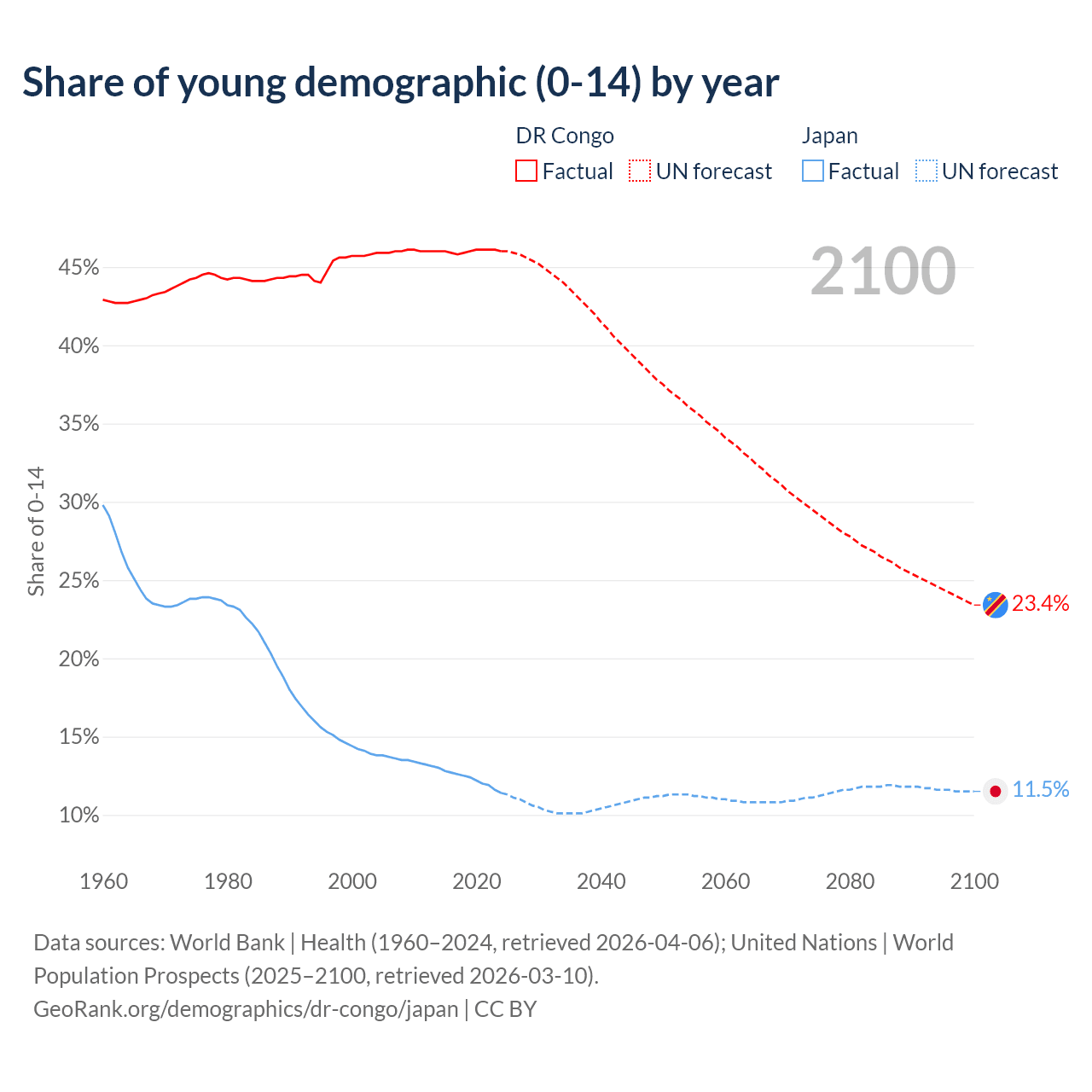 - The share of young demographic (0-15 years old) in the DR Congo is 46% vs 11.4% in Japan.