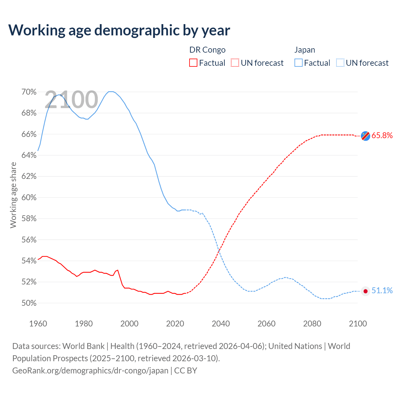 - The DR Congo has 59.8M working age adults (aged 15-64) vs 72.1M in Japan.