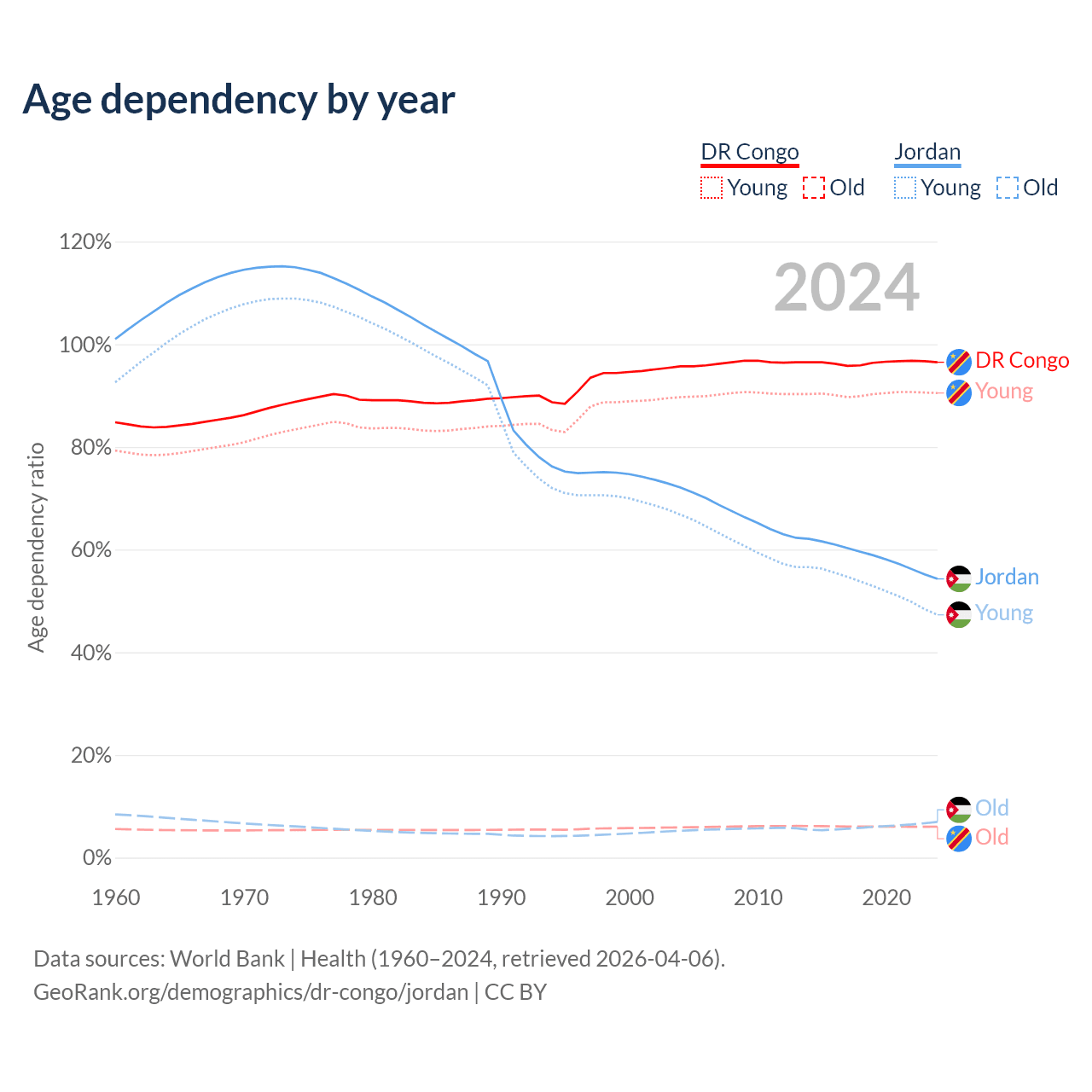 - The DR Congo is ranked 191/196 by median age (oldest to youngest) vs 131/196 for Jordan.
