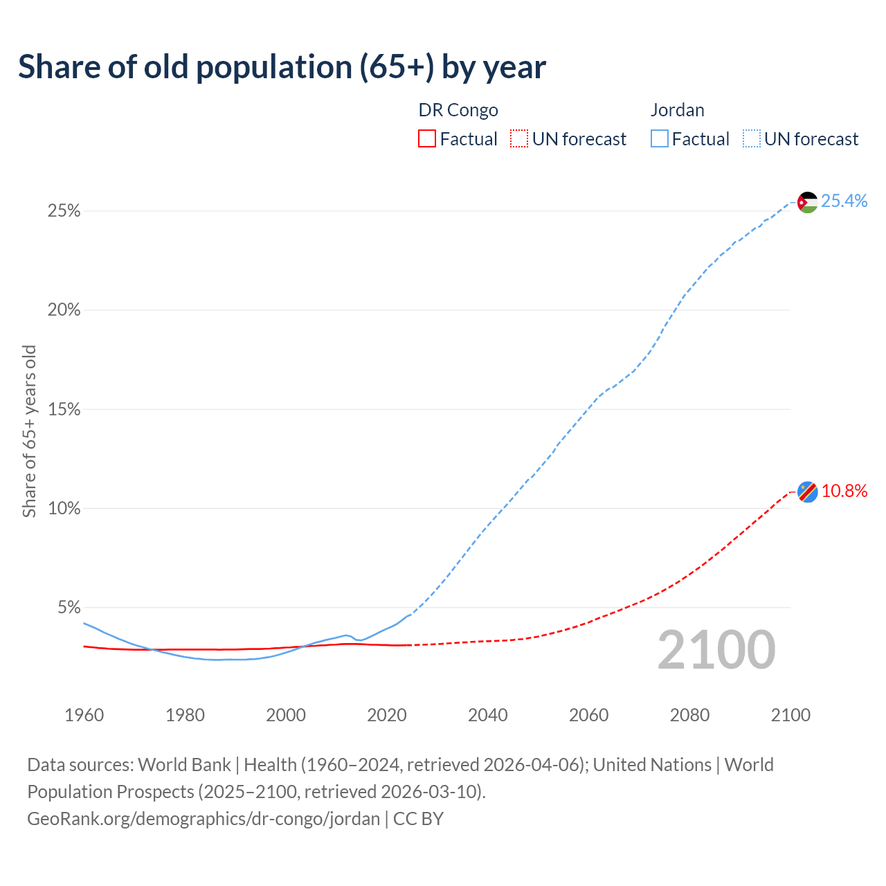 The share of older people aged 65 and over is 3.08% in the DR Congo and 4.52% in Jordan. Life expectancy in the DR Congo compared to Jordan .