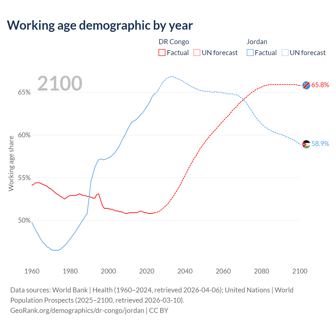 - The DR Congo has 59.8M working age adults (aged 15-64) vs 7.49M in Jordan.