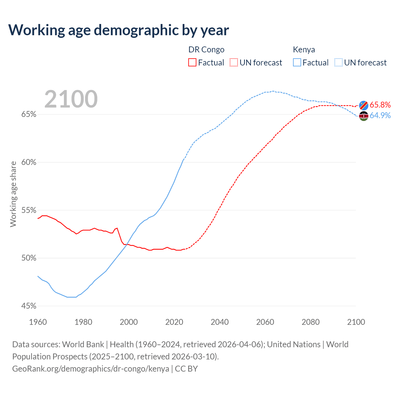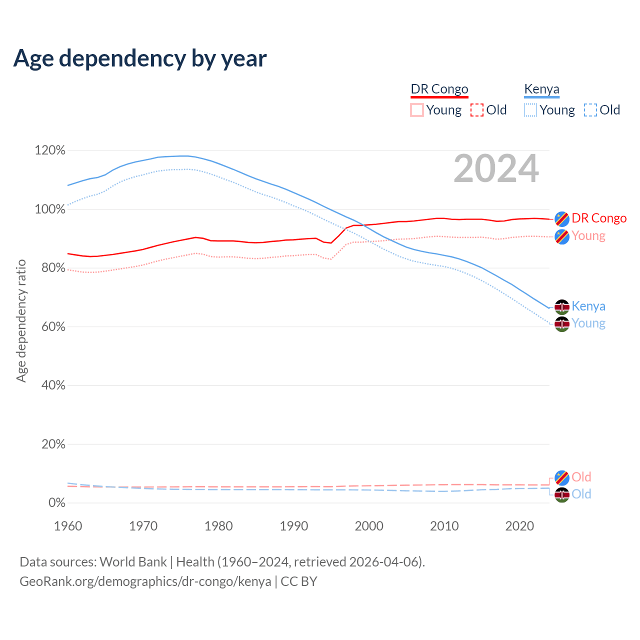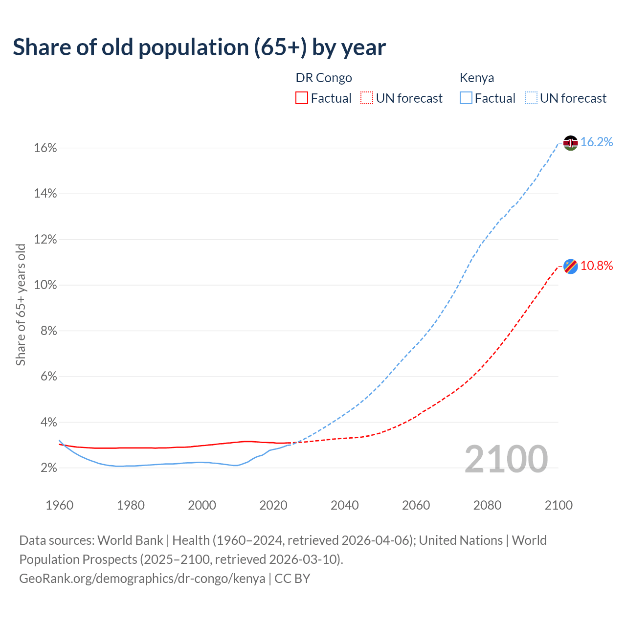 The share of older people aged 65 and over is 3.08% in the DR Congo and 2.97% in Kenya. Life expectancy in the DR Congo compared to Kenya .