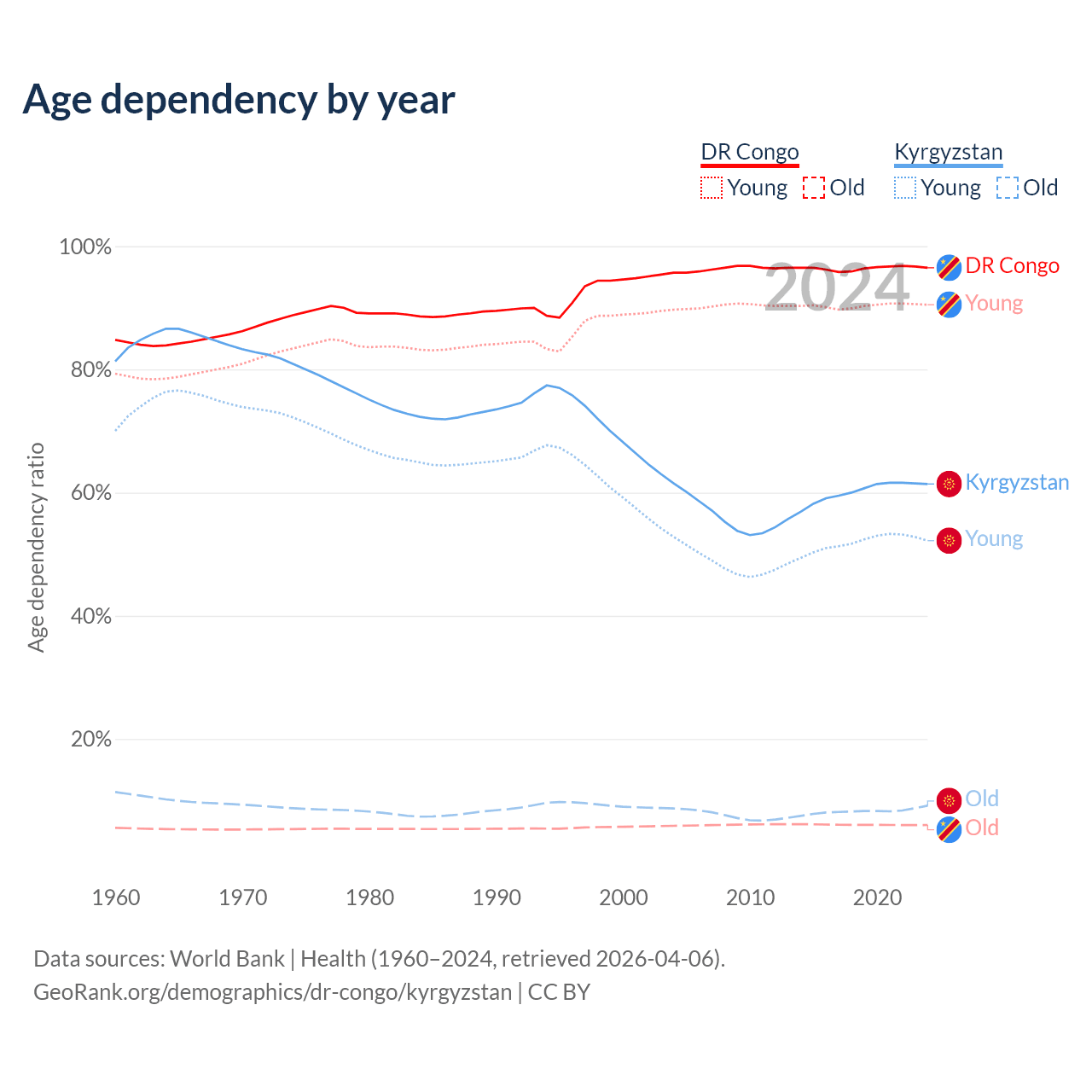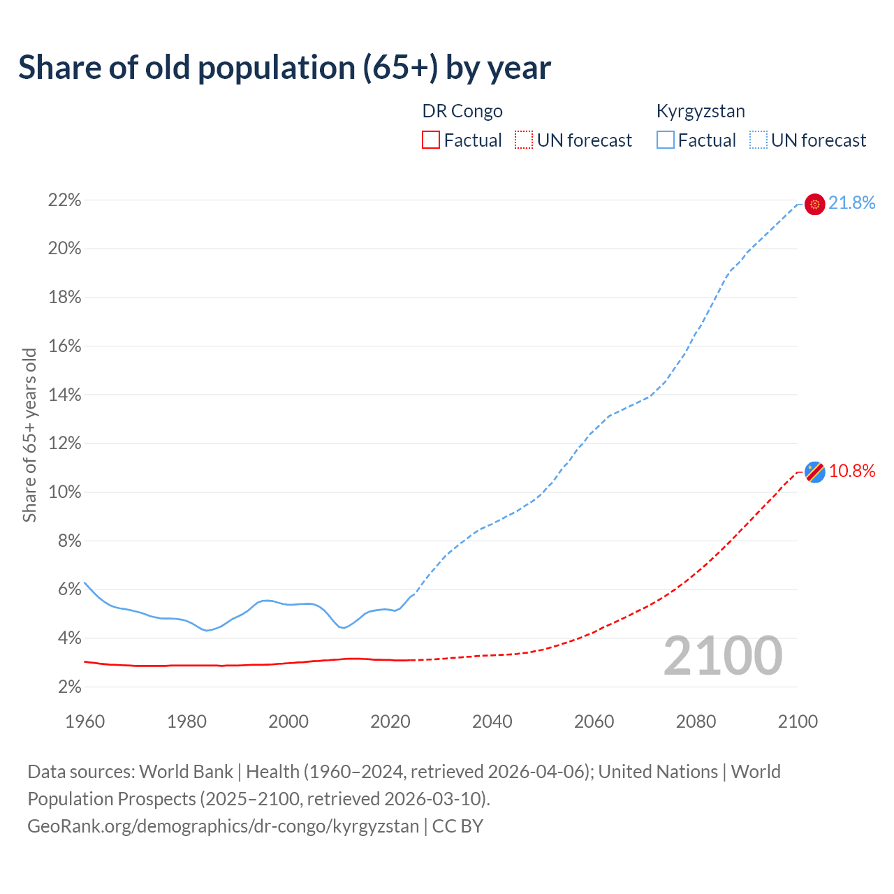 - The share of old-age demographic (65+) in the DR Congo is 3.08% vs 5.68% in Kyrgyzstan.