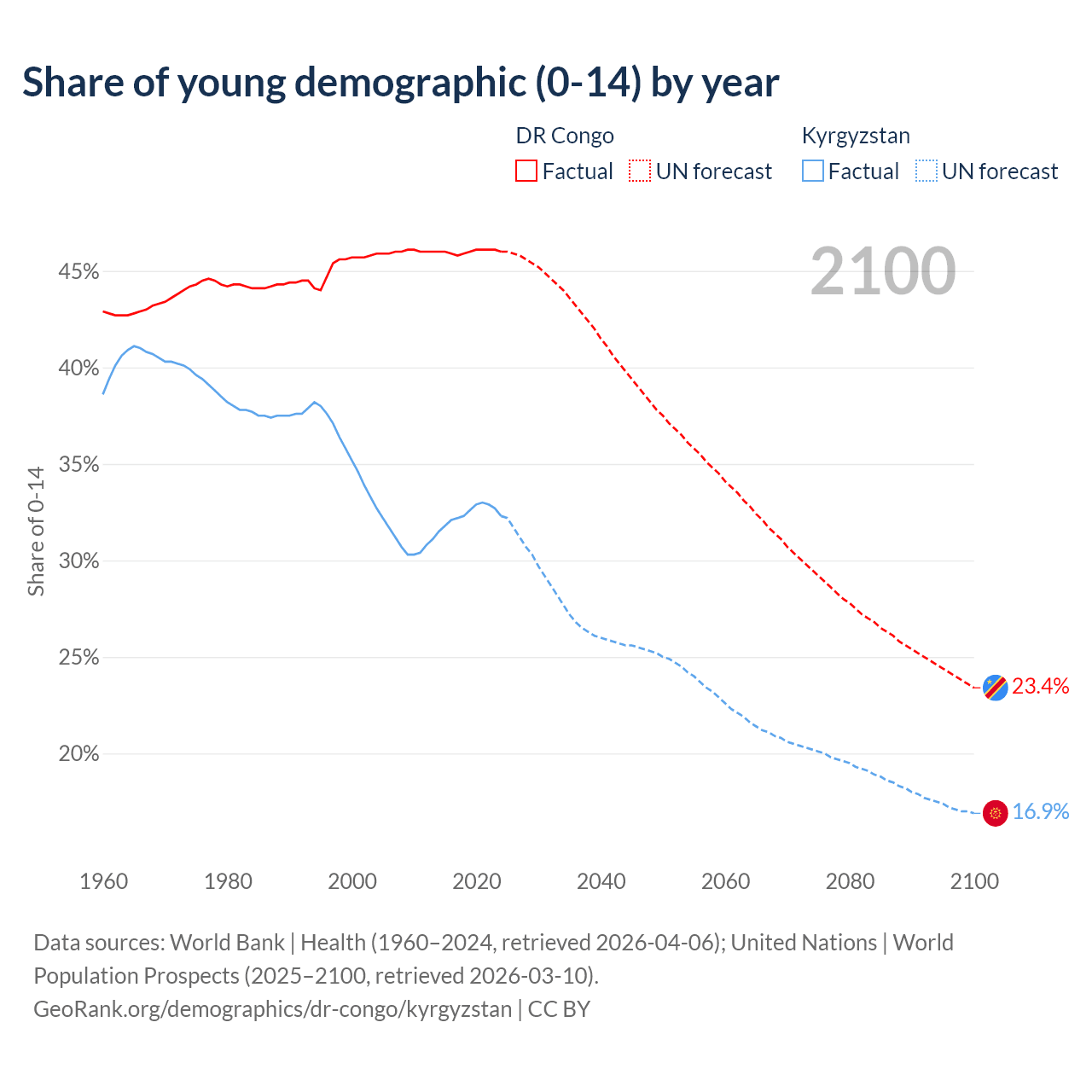 - The share of young demographic (0-15 years old) in the DR Congo is 46% vs 32.3% in Kyrgyzstan.