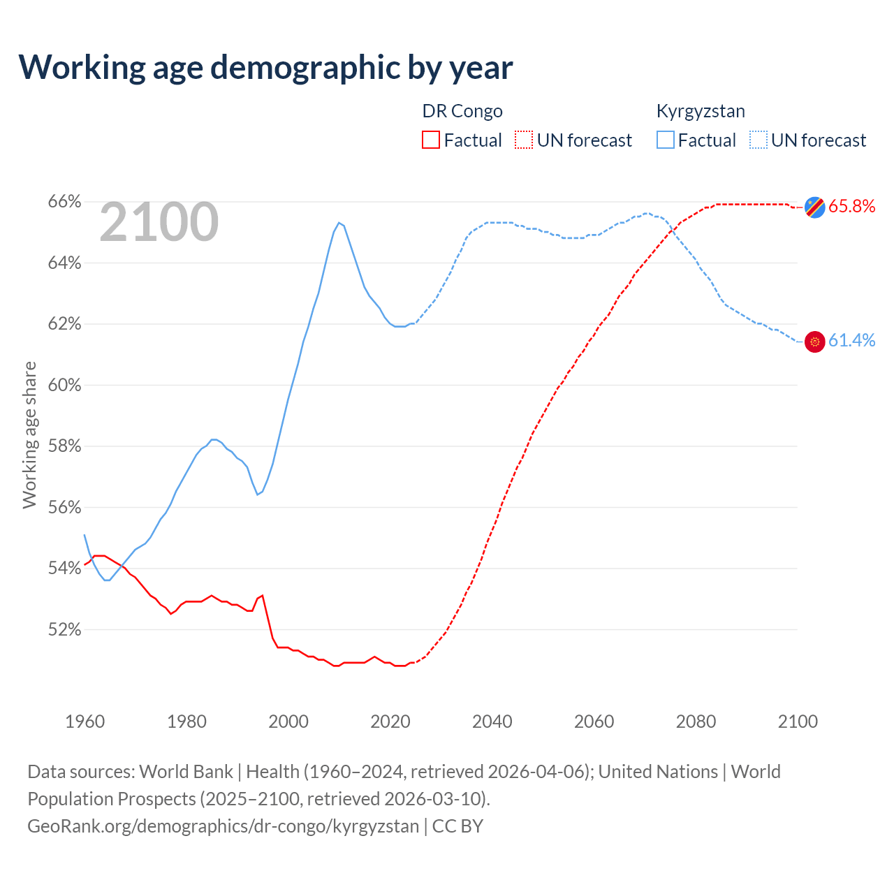 - The DR Congo has 59.8M working age adults (aged 15-64) vs 4.63M in Kyrgyzstan.