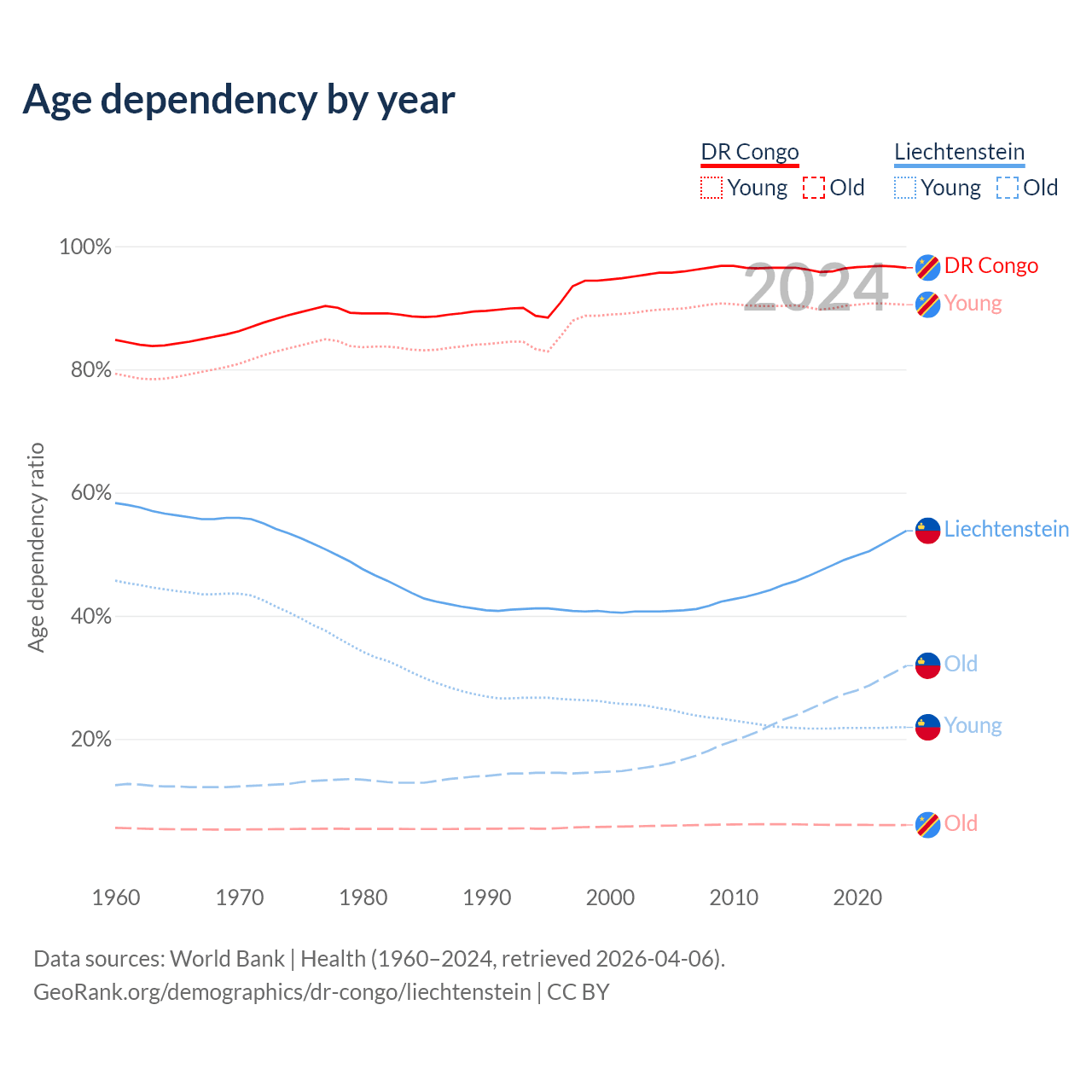 - The share of old-age demographic (65+) in the DR Congo is 3.08% vs 20.7% in Liechtenstein.