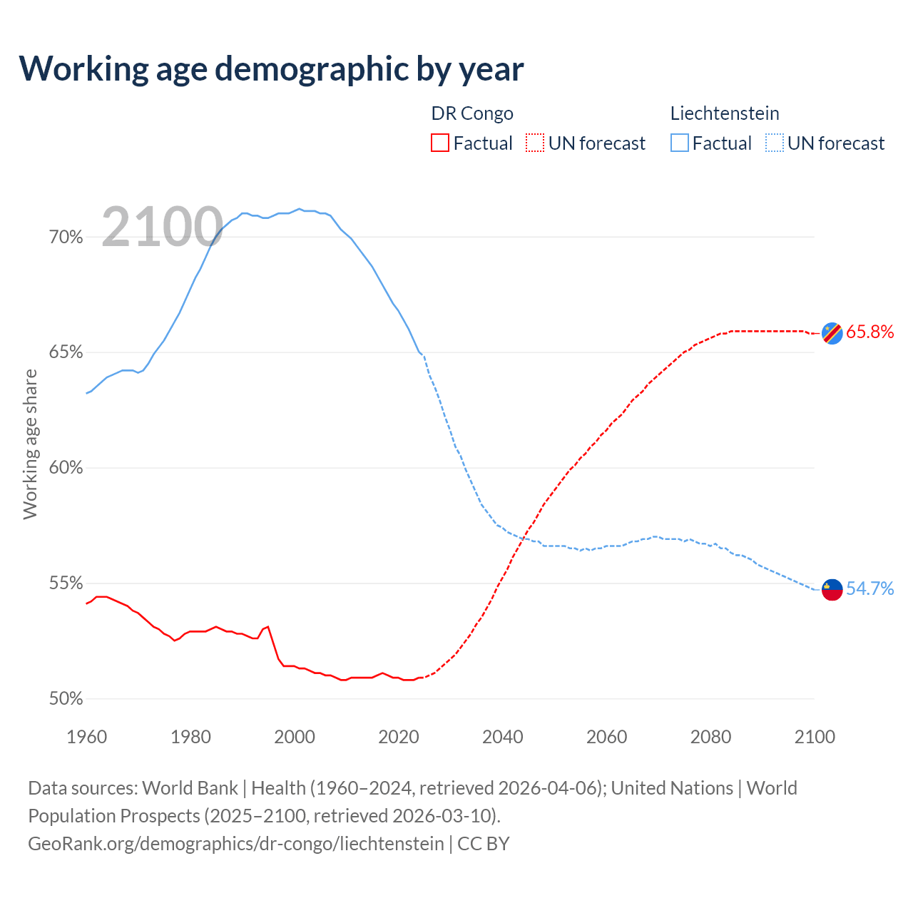 The share of older people aged 65 and over is 3.08% in the DR Congo and 20.7% in Liechtenstein. Life expectancy in the DR Congo compared to Liechtenstein .