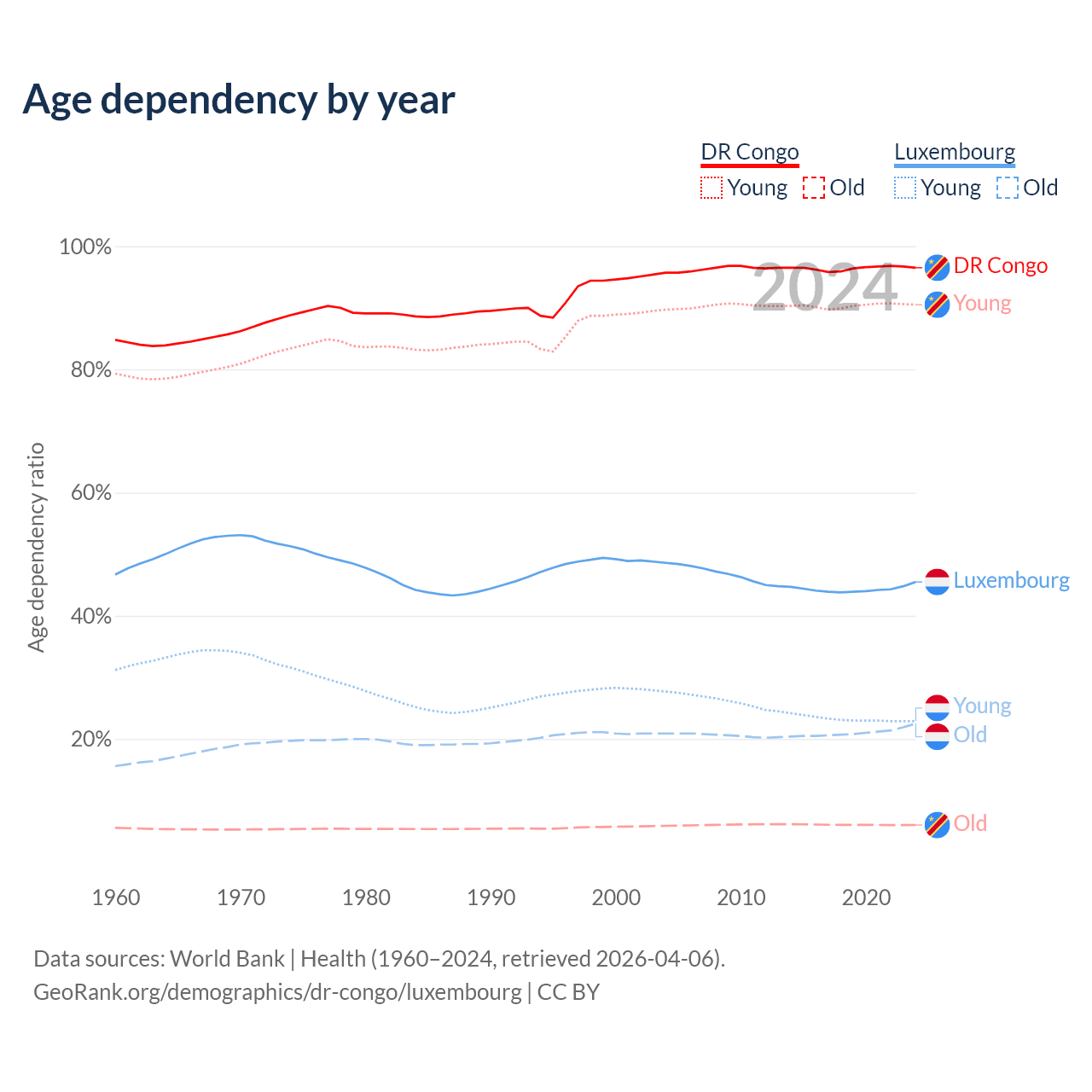 - The share of old-age demographic (65+) in the DR Congo is 3.08% vs 15.5% in Luxembourg.