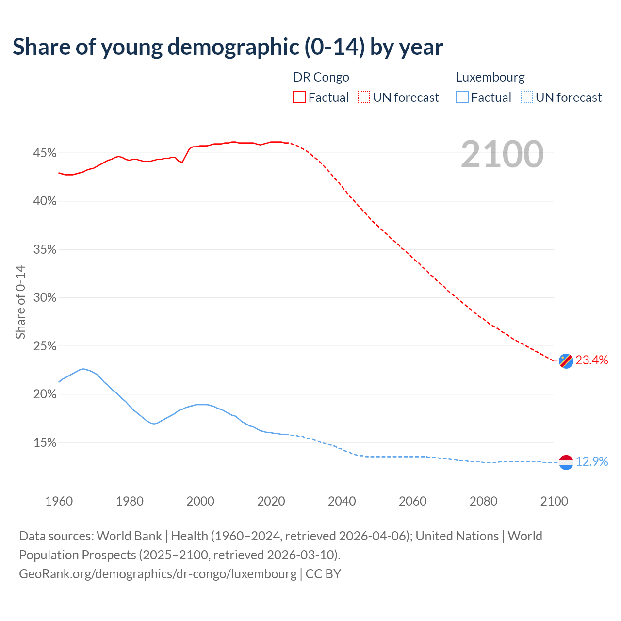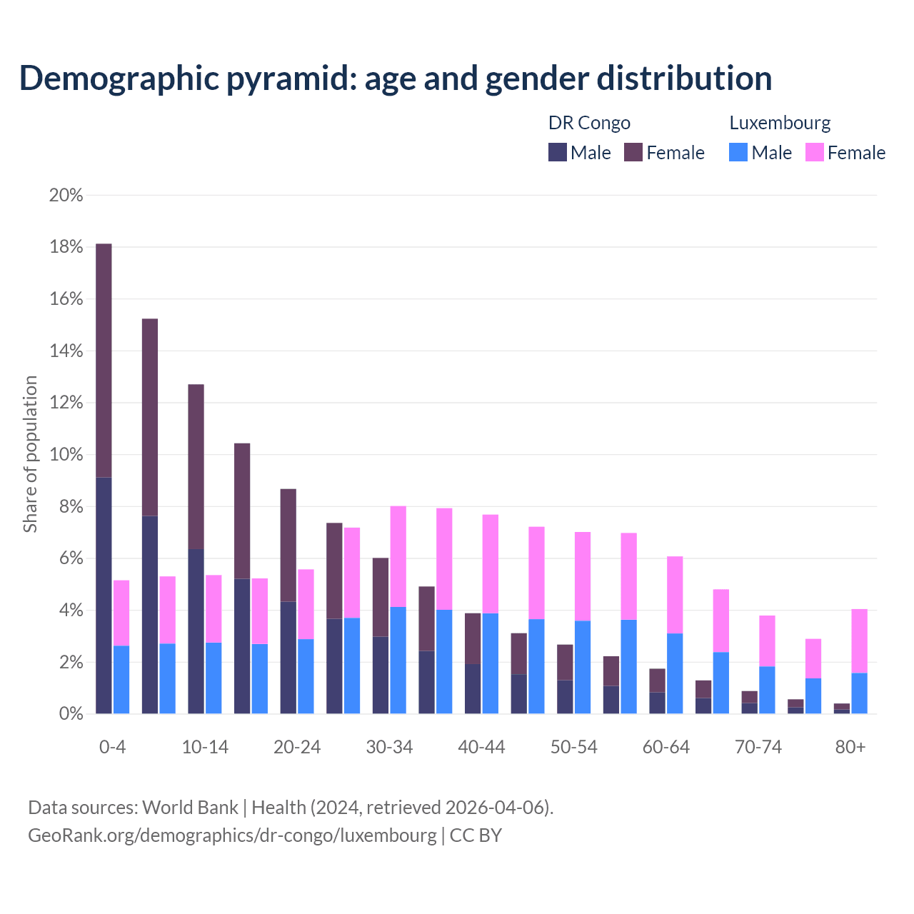- The share of young demographic (0-15 years old) in the DR Congo is 46% vs 15.8% in Luxembourg.