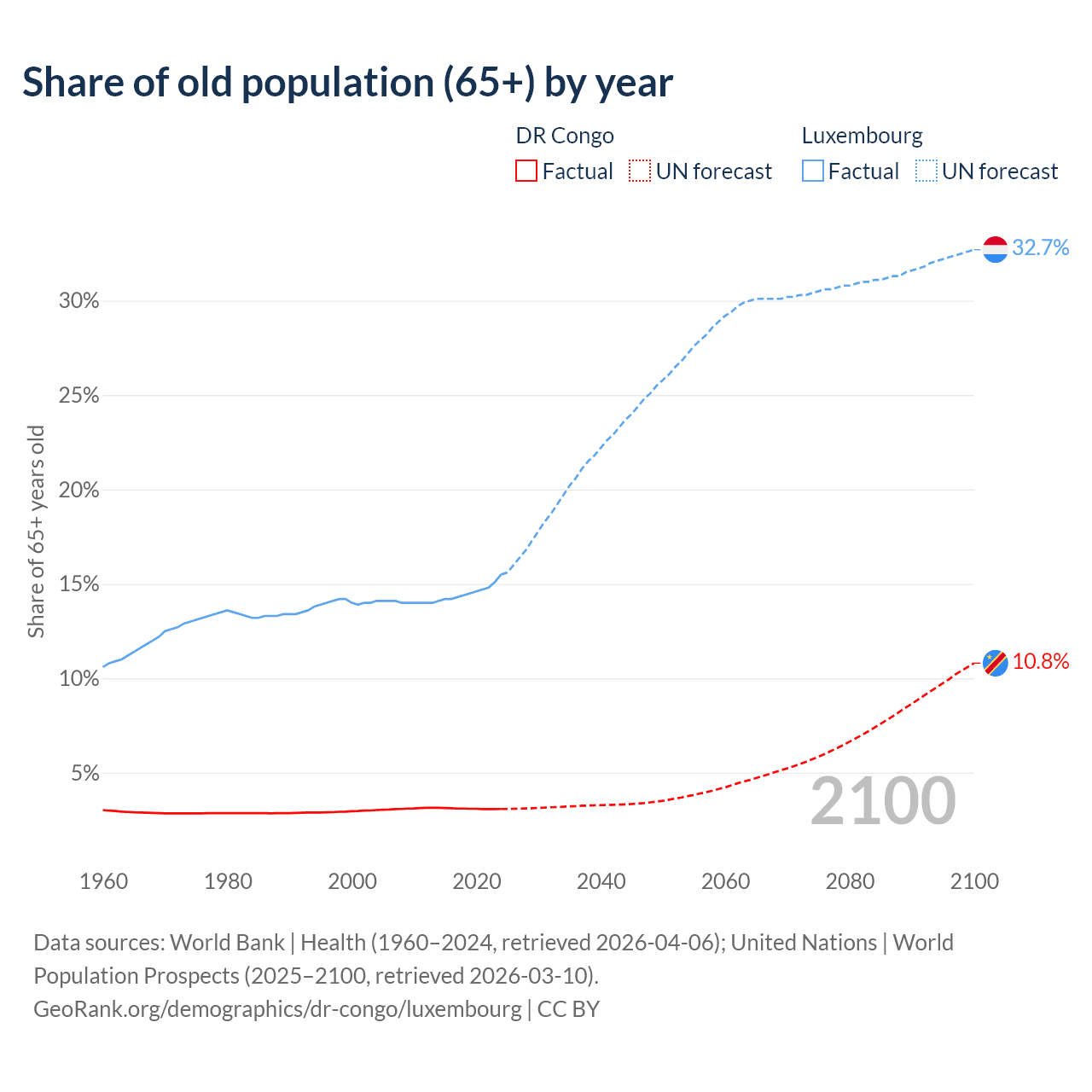 The share of older people aged 65 and over is 3.08% in the DR Congo and 15.5% in Luxembourg. Life expectancy in the DR Congo compared to Luxembourg .
