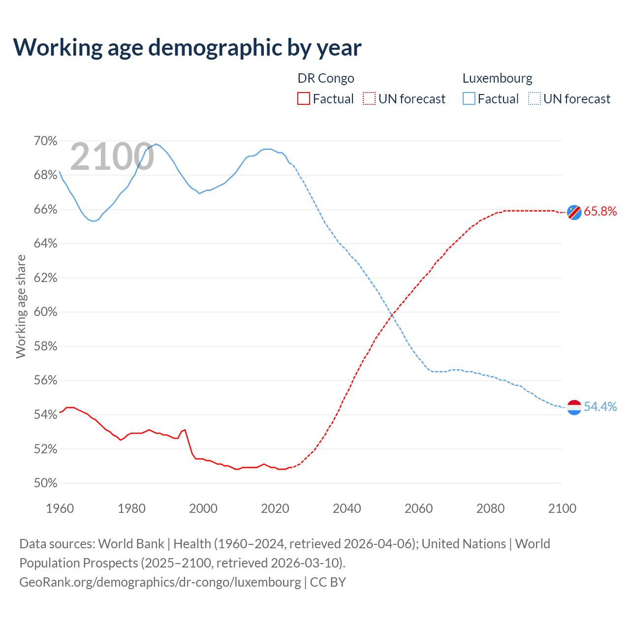 Median age DR Congo vs Luxembourg, 1960-2100