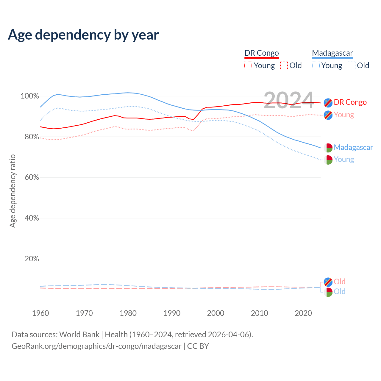 - The share of old-age demographic (65+) in the DR Congo is 3.08% vs 3.41% in Madagascar.