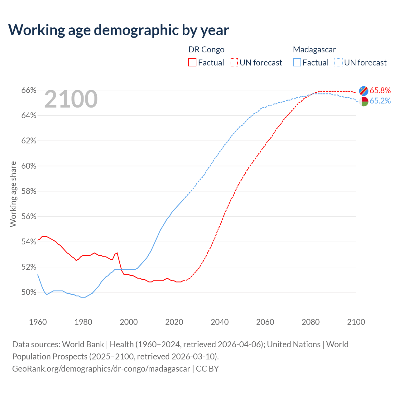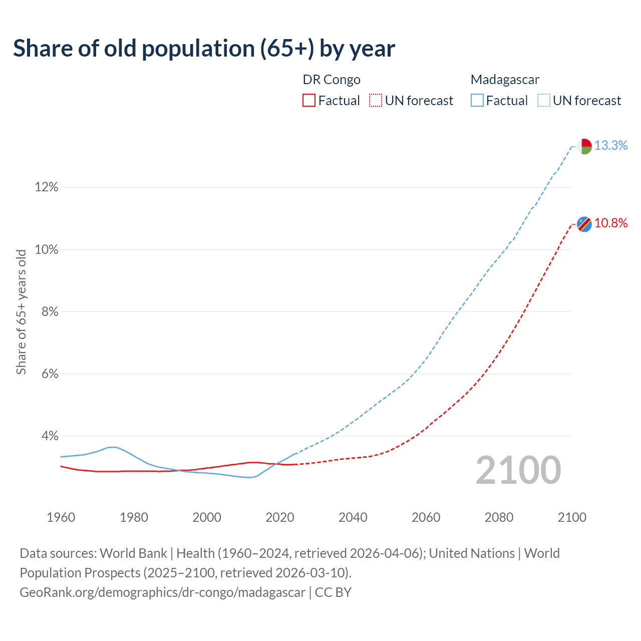 The share of older people aged 65 and over is 3.08% in the DR Congo and 3.41% in Madagascar. Life expectancy in the DR Congo compared to Madagascar .