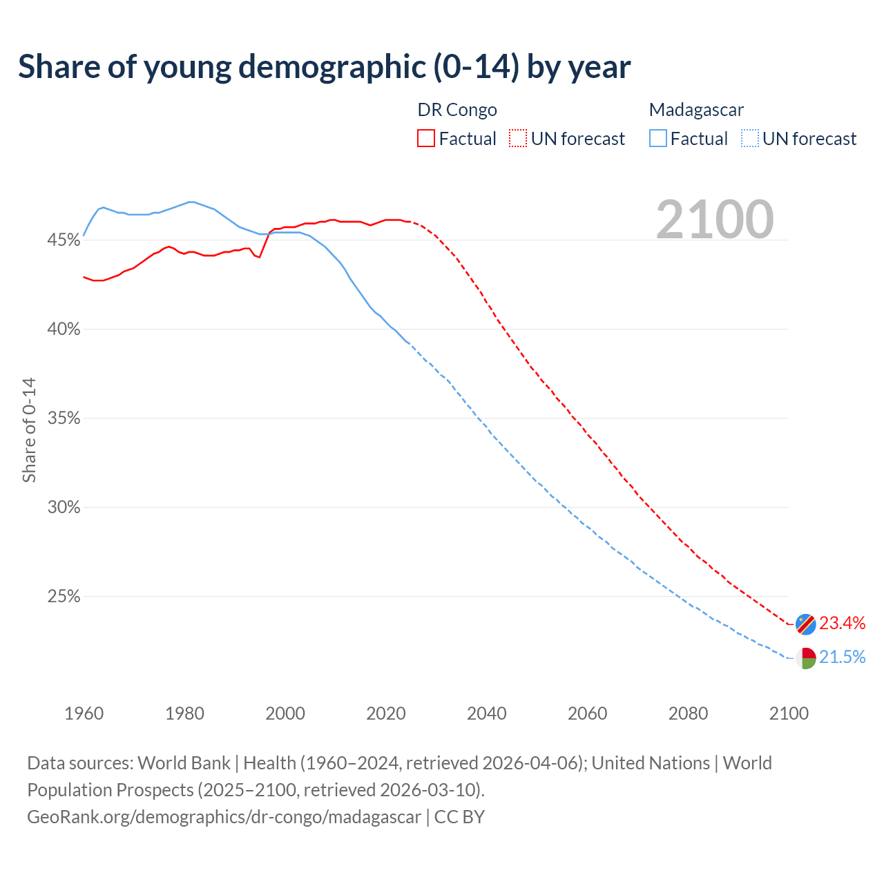 - The share of young demographic (0-15 years old) in the DR Congo is 46% vs 39.3% in Madagascar.