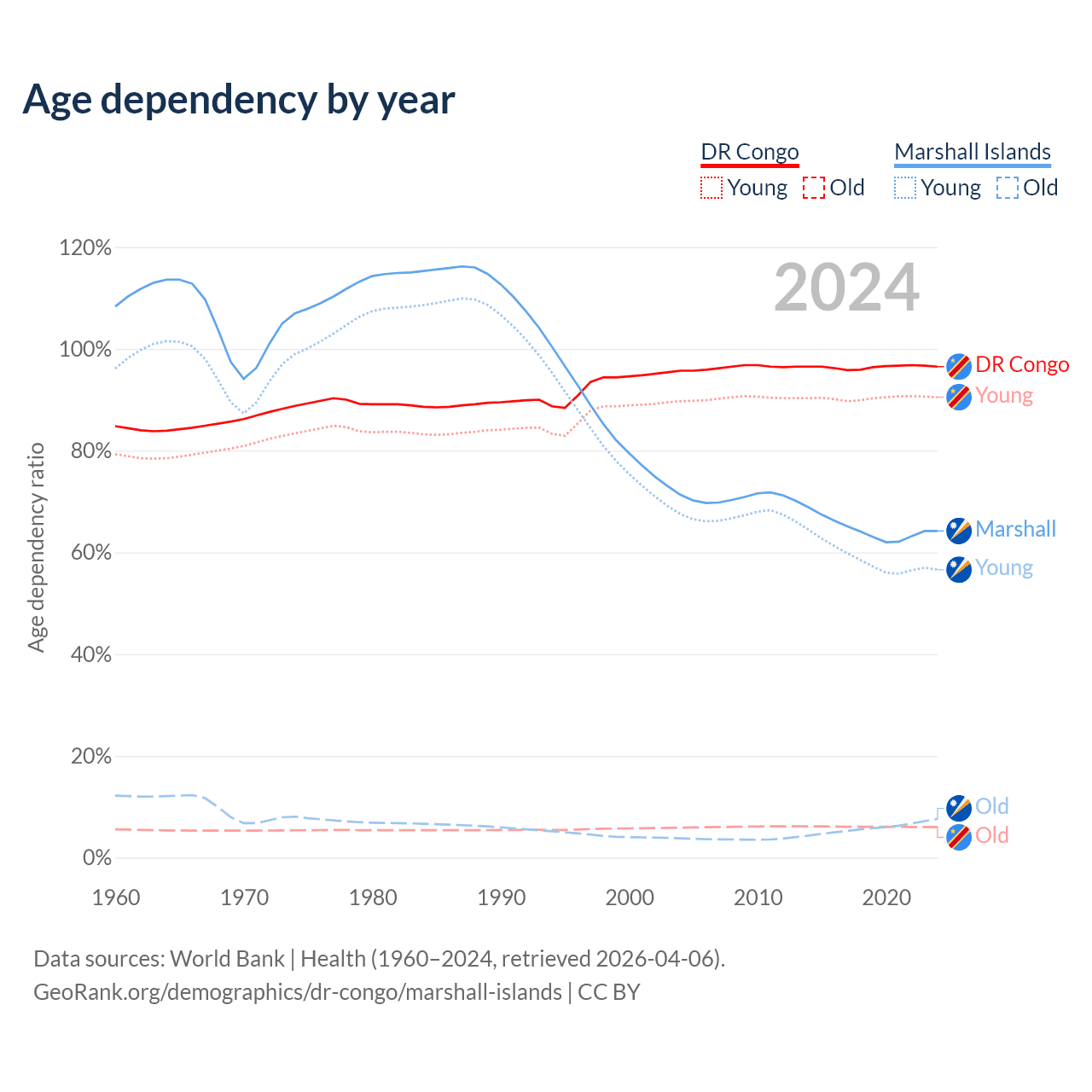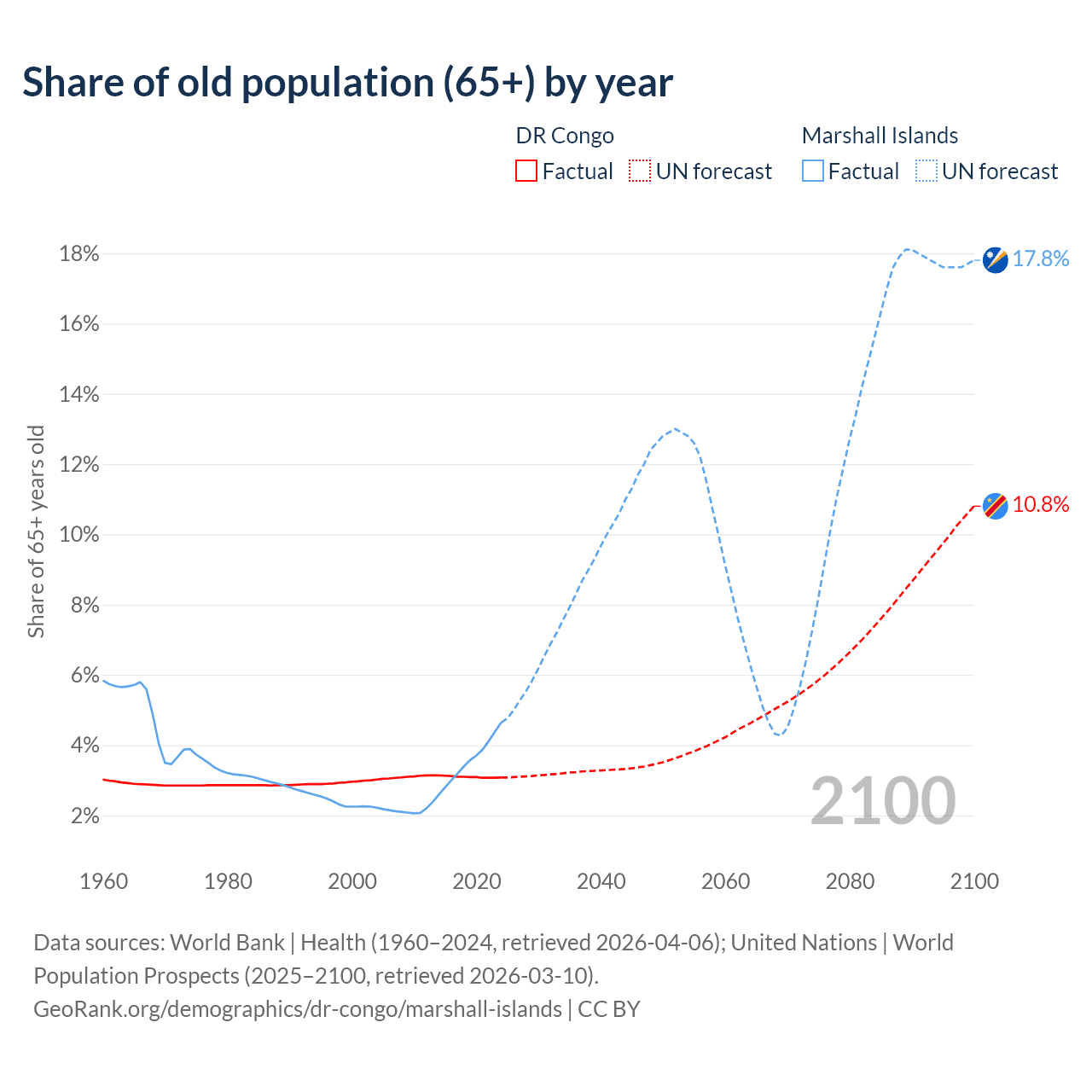 - The share of old-age demographic (65+) in the DR Congo is 3.08% vs 4.64% in the Marshall Islands.
