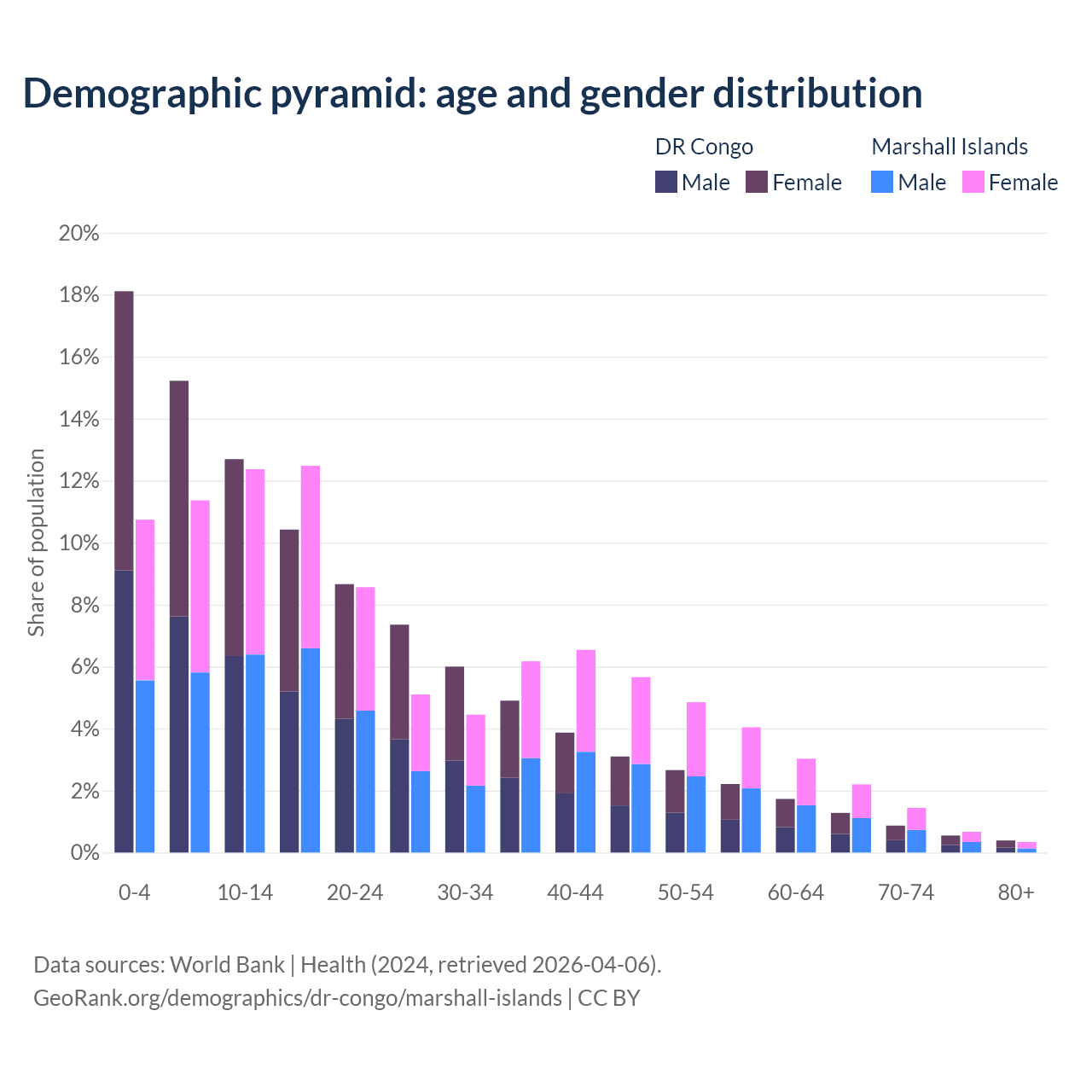 - The DR Congo is ranked 191/196 by median age (oldest to youngest) vs 150/196 for the Marshall Islands.