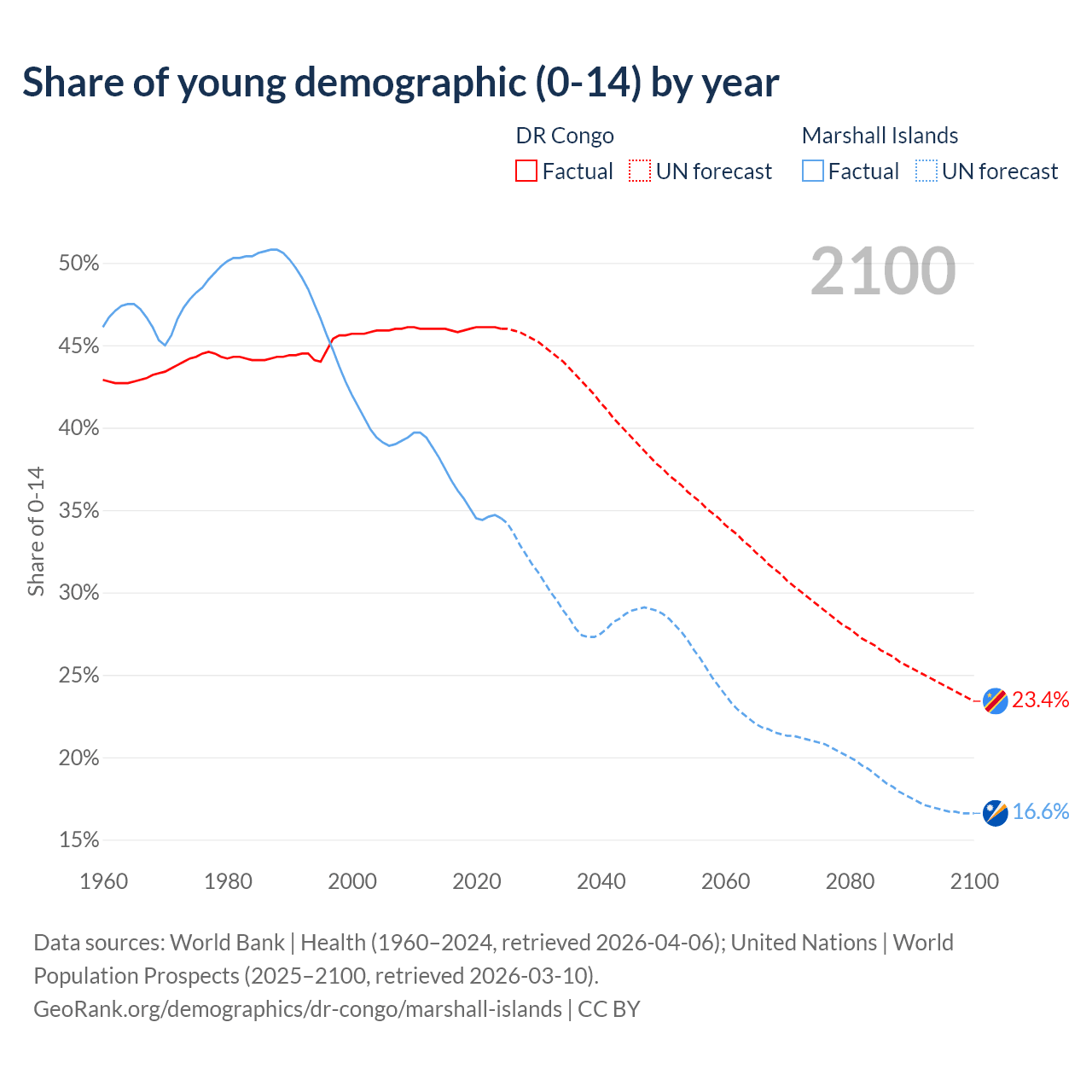 - The share of young demographic (0-15 years old) in the DR Congo is 46% vs 34.5% in the Marshall Islands.