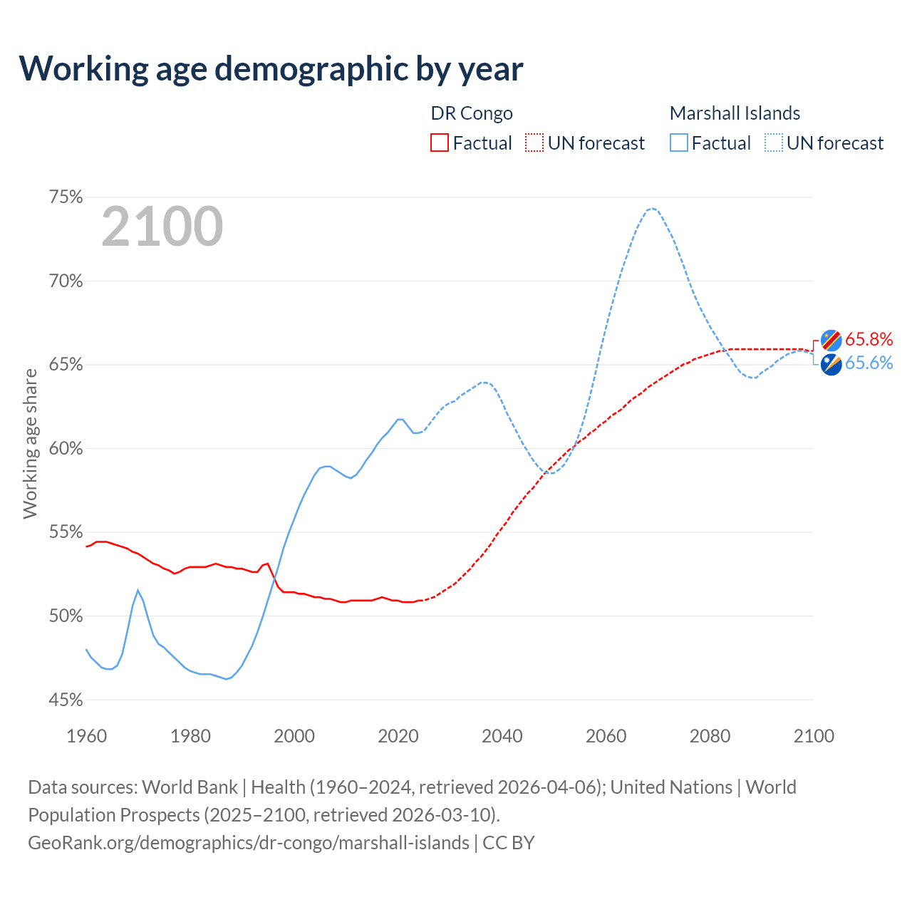 - The DR Congo has 59.8M working age adults (aged 15-64) vs 21.3K in the Marshall Islands.