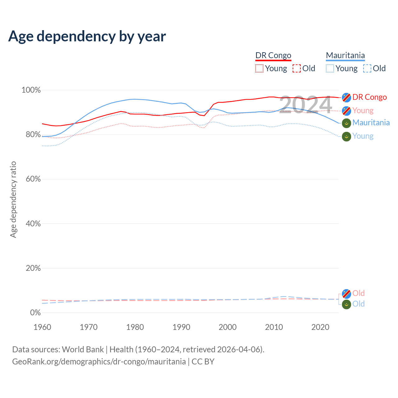 - The share of old-age demographic (65+) in the DR Congo is 3.08% vs 3.23% in Mauritania.