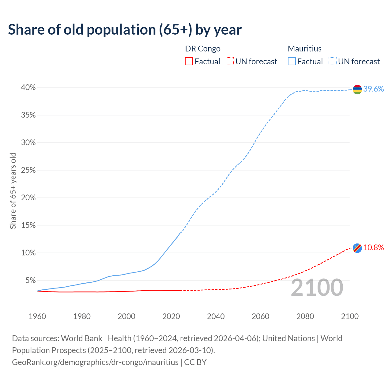 - The share of old-age demographic (65+) in the DR Congo is 3.08% vs 13.5% in Mauritius.