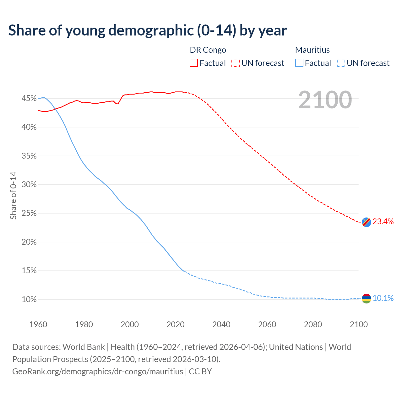 - The share of young demographic (0-15 years old) in the DR Congo is 46% vs 14.8% in Mauritius.