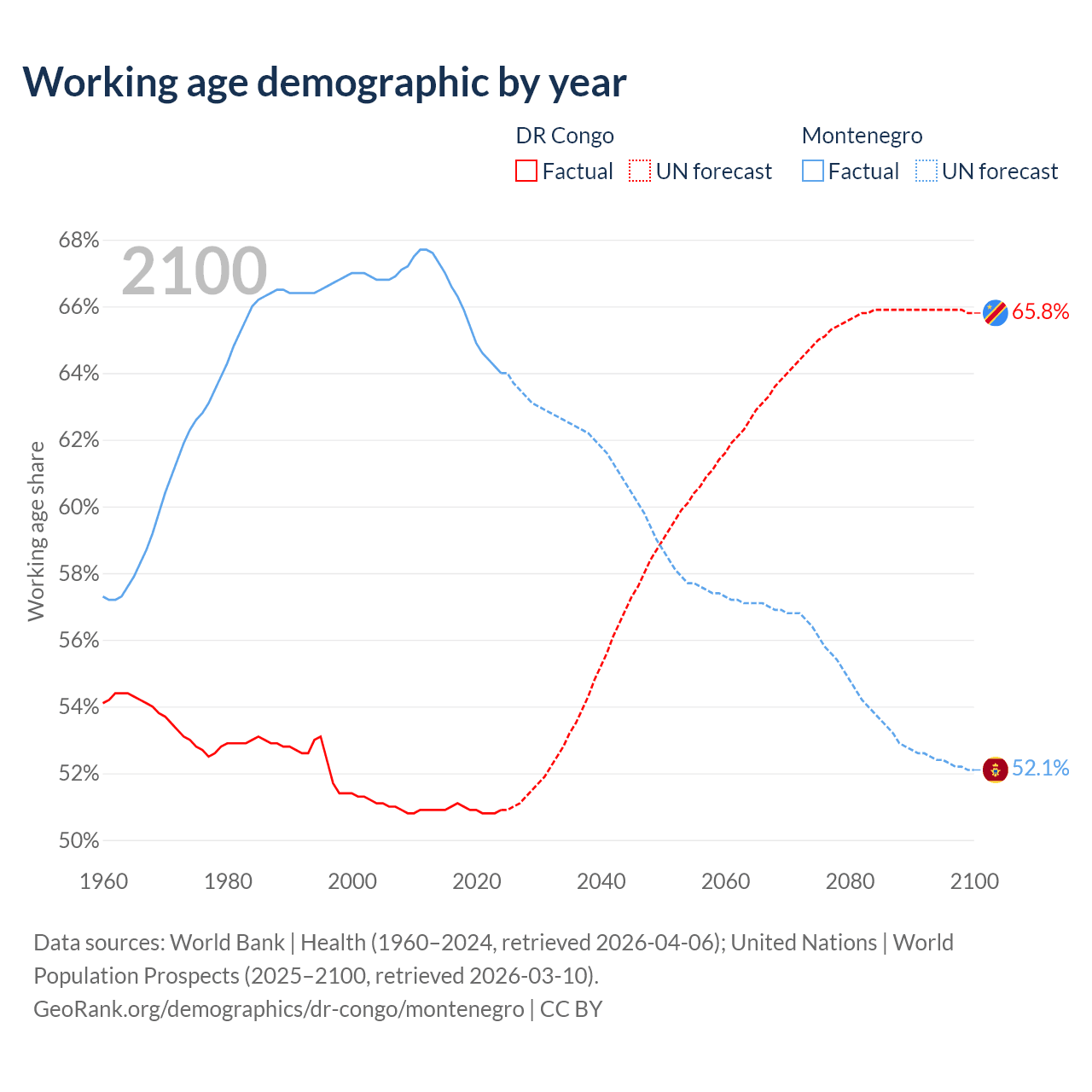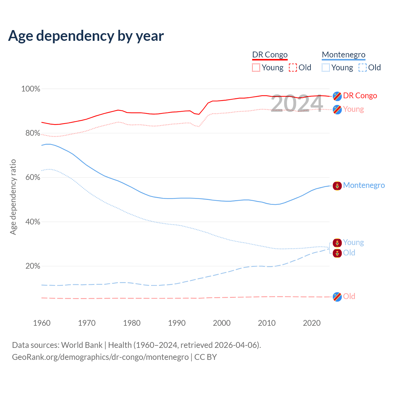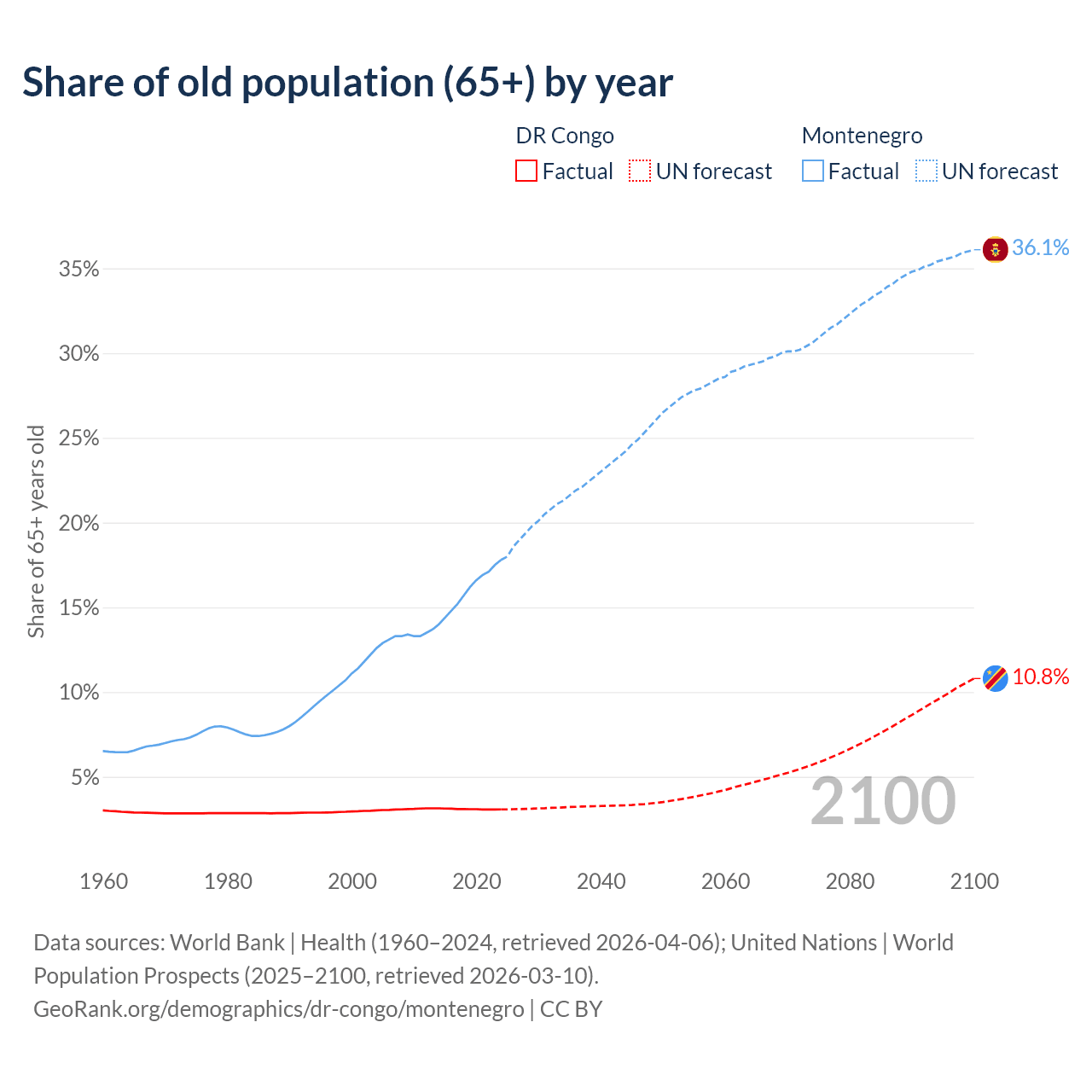 - The share of old-age demographic (65+) in the DR Congo is 3.08% vs 17.8% in Montenegro.