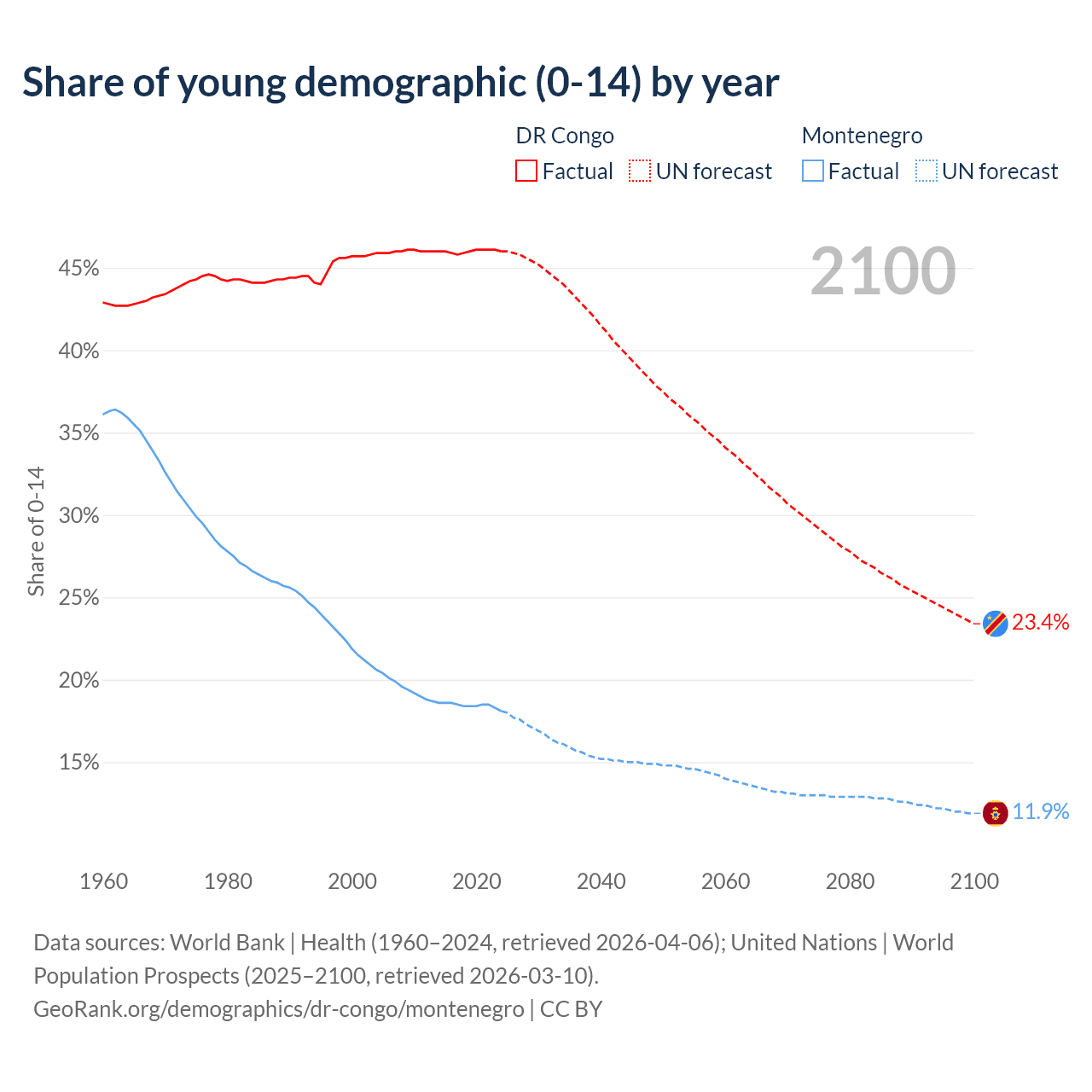 - The share of young demographic (0-15 years old) in the DR Congo is 46% vs 18.1% in Montenegro.