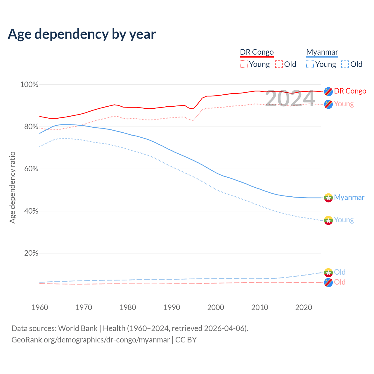- The share of old-age demographic (65+) in the DR Congo is 3.08% vs 7.3% in Myanmar.