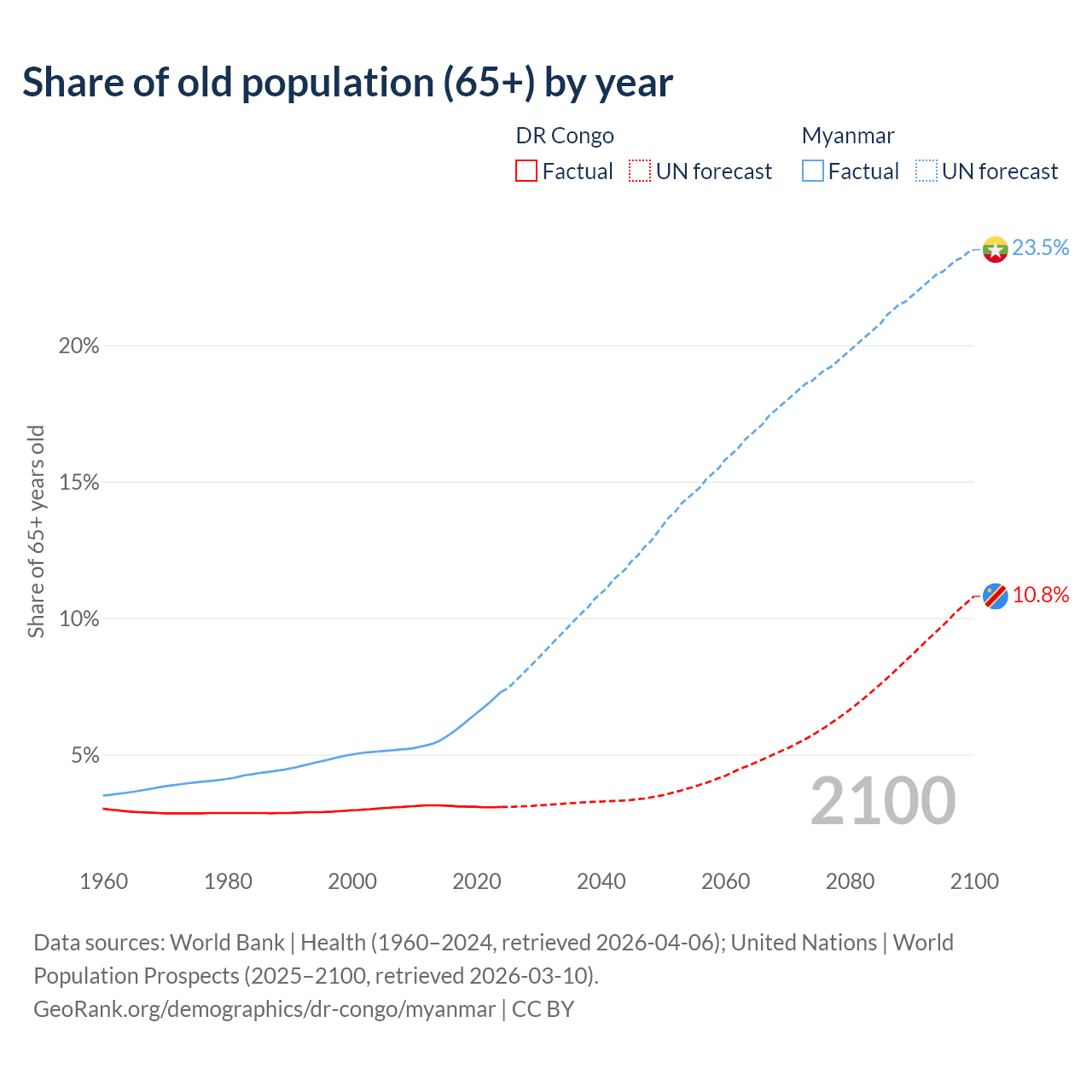 The share of older people aged 65 and over is 3.08% in the DR Congo and 7.3% in Myanmar. Life expectancy in the DR Congo compared to Myanmar .