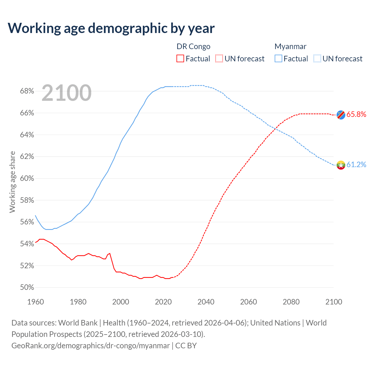 Median age DR Congo vs Myanmar, 1960-2100