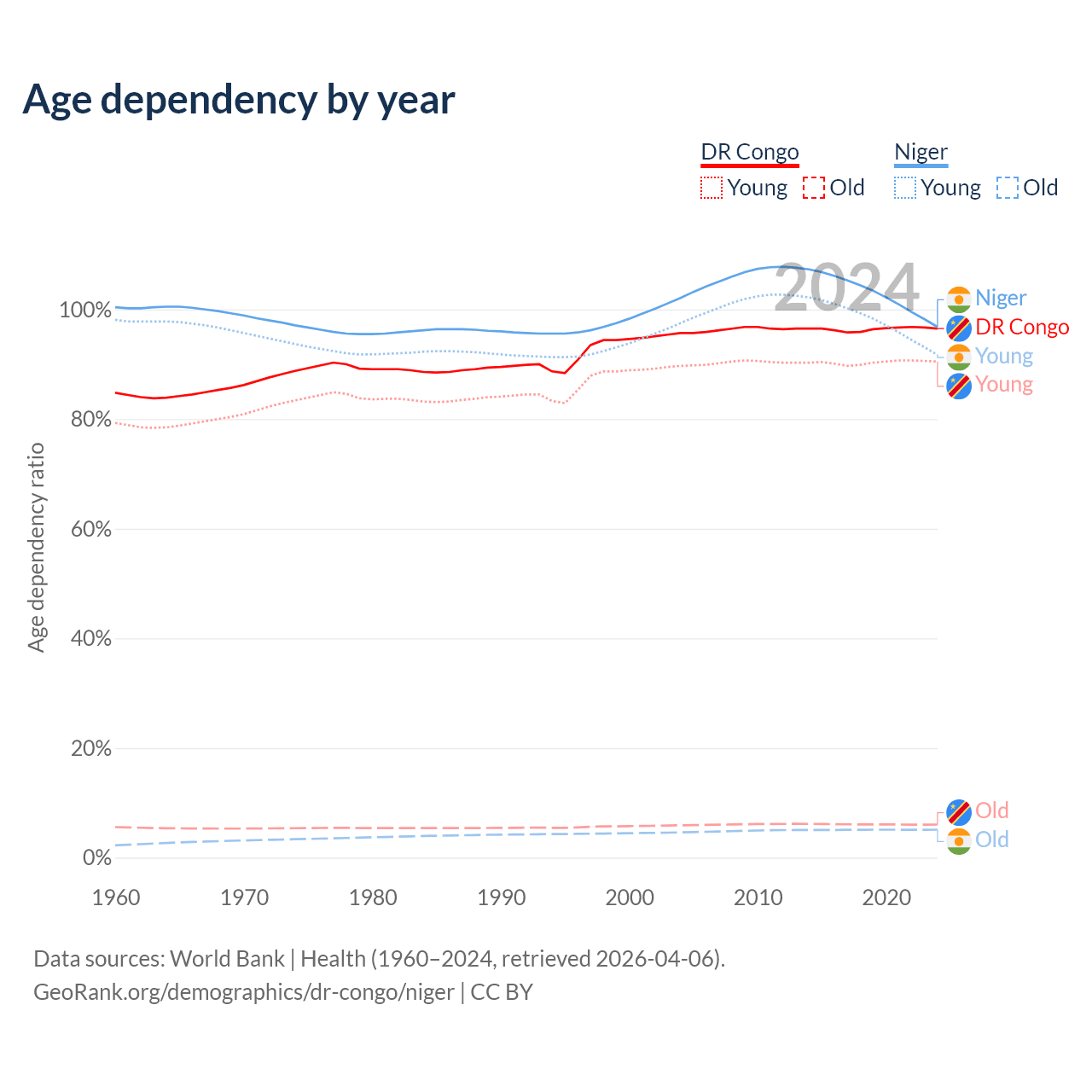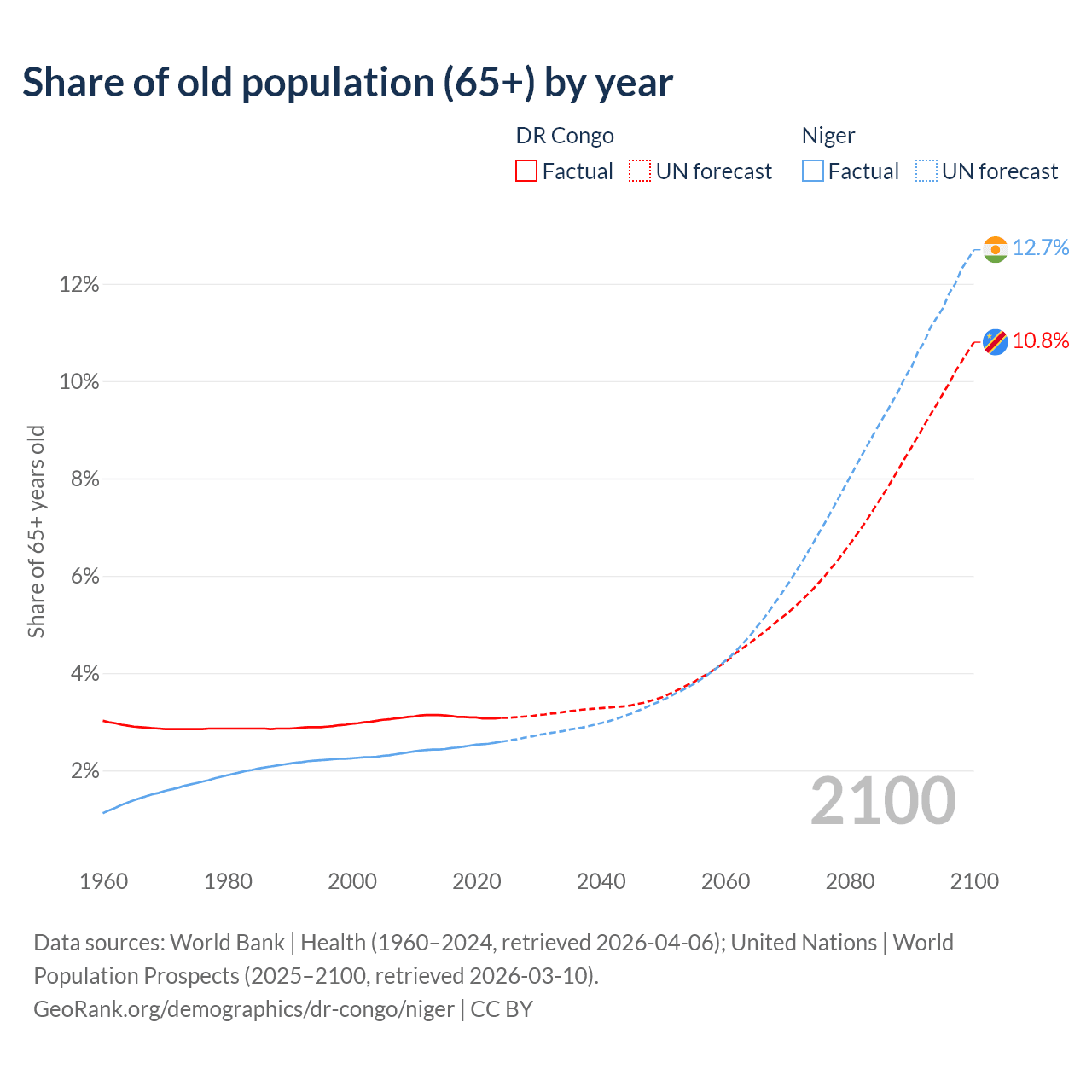 - The share of old-age demographic (65+) in the DR Congo is 3.08% vs 2.59% in Niger.