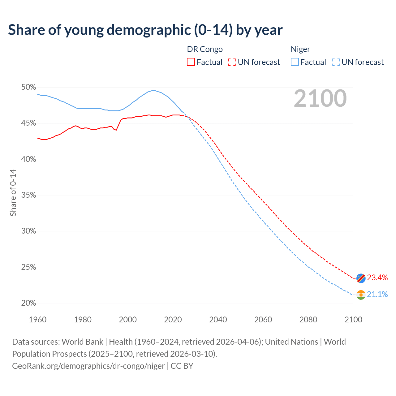- The share of young demographic (0-15 years old) in the DR Congo is 46% vs 46.6% in Niger.