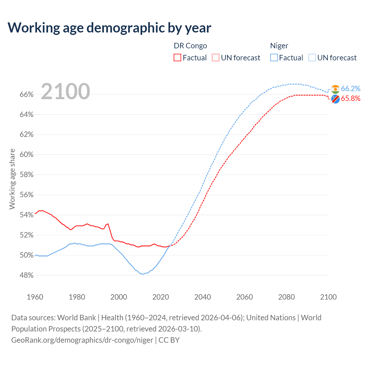 - The DR Congo has 59.8M working age adults (aged 15-64) vs 14.8M in Niger.