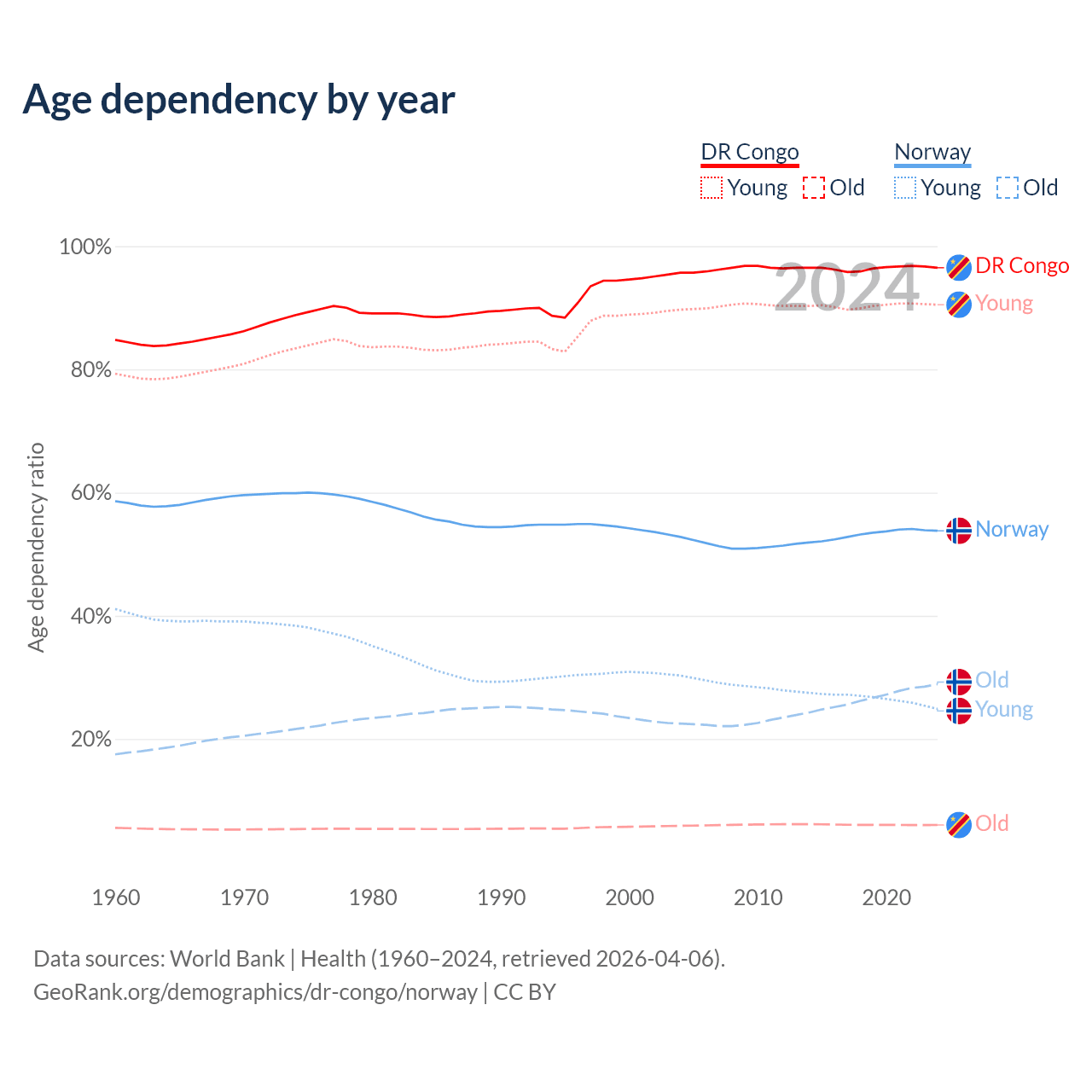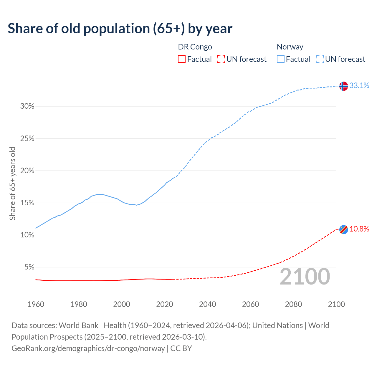- The share of old-age demographic (65+) in the DR Congo is 3.08% vs 18.8% in Norway.