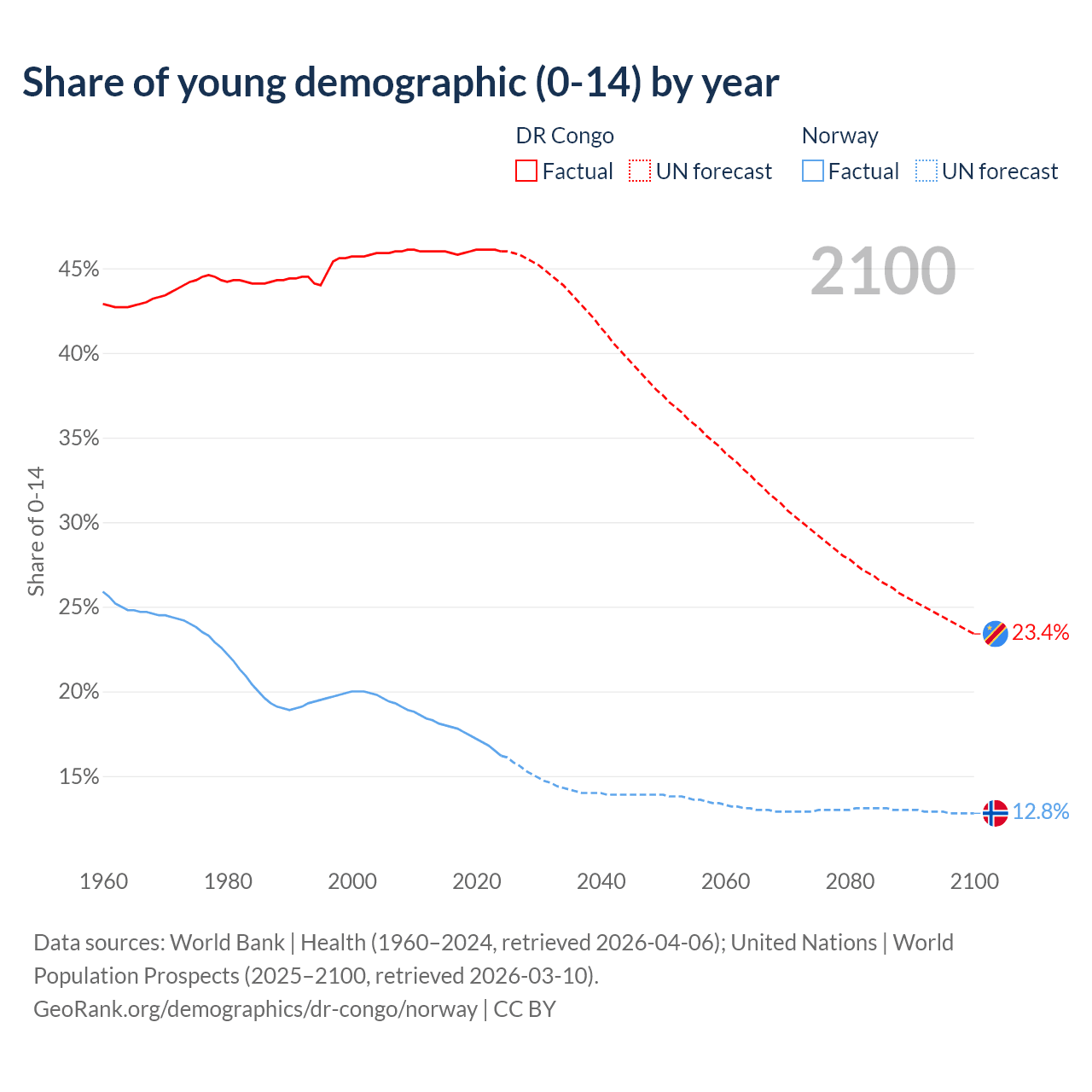 - The share of young demographic (0-15 years old) in the DR Congo is 46% vs 16.2% in Norway.