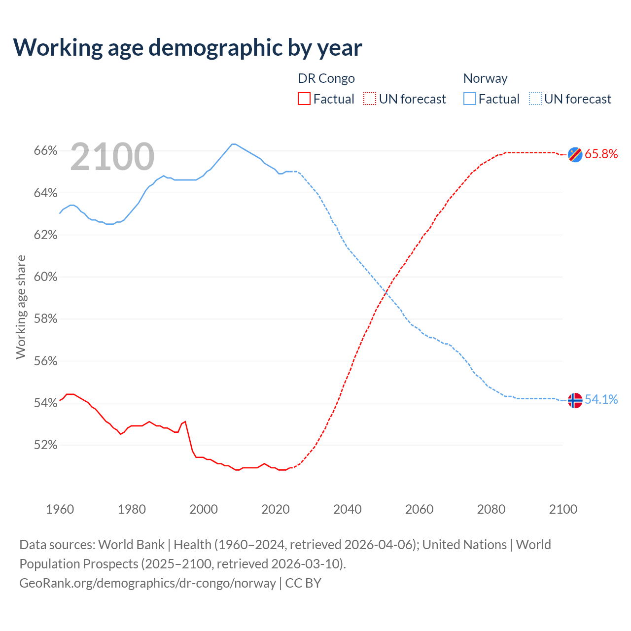 - The DR Congo has 59.8M working age adults (aged 15-64) vs 3.69M in Norway.
