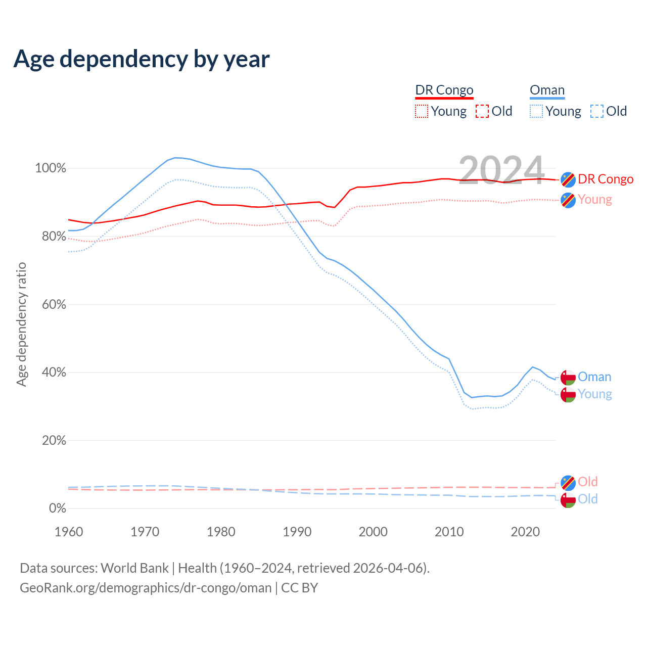 - The share of old-age demographic (65+) in the DR Congo is 3.08% vs 2.64% in Oman.