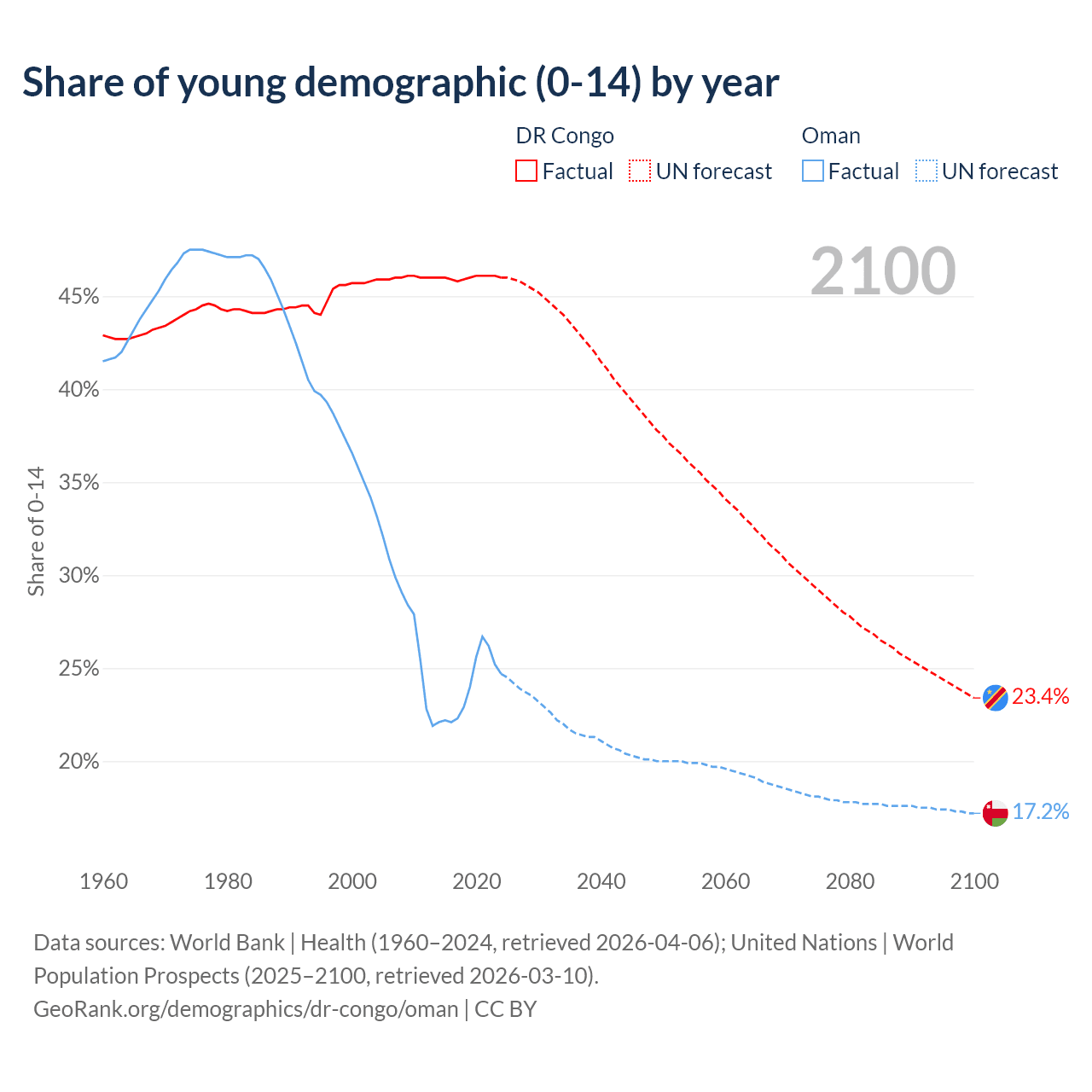 - The share of young demographic (0-15 years old) in the DR Congo is 46% vs 24.7% in Oman.