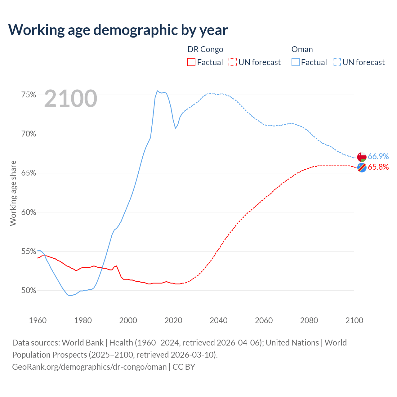 The share of older people aged 65 and over is 3.08% in the DR Congo and 2.64% in Oman. Life expectancy in the DR Congo compared to Oman .