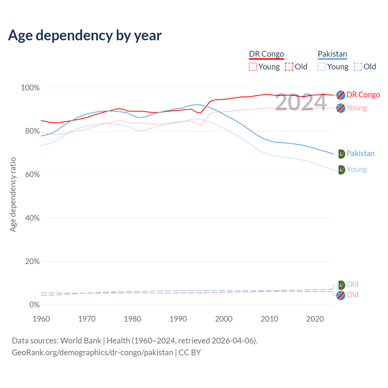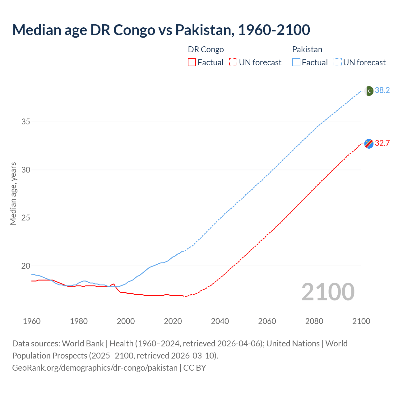 - The DR Congo is ranked 191/196 by median age (oldest to youngest) vs 154/196 for Pakistan.