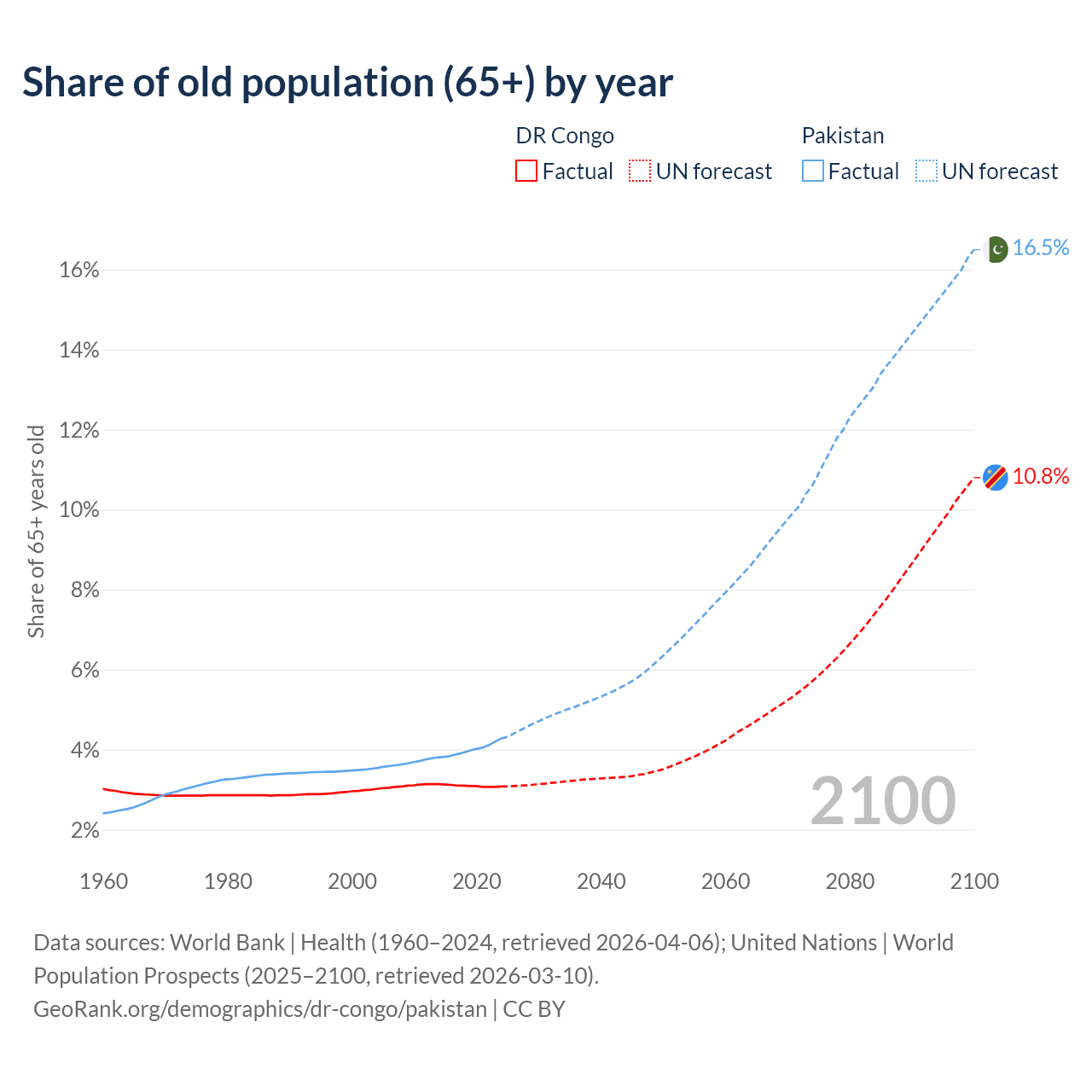 - The share of old-age demographic (65+) in the DR Congo is 3.08% vs 4.28% in Pakistan.